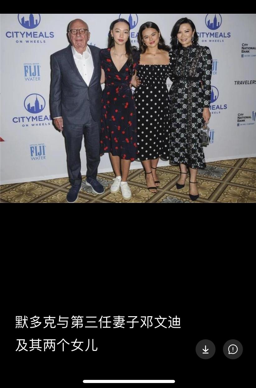 世界报业大亨默多克的五任妻子 他的现任妻子埃琳娜才华与颜值并存,今年6 9岁,比他小2 6岁,她是俄罗斯裔的分子生物学家。两人2024年结婚, 彼时他93岁,她67岁,两人在一起两年了,感情很好。值得一提的是埃琳娜是邓文迪牵线介绍给默多克的。 默多克的第一任妻子是一名空姐,两人在一起11年。两人育有一女,两人离婚后,其长女由默多克拥有女儿的抚养。他的大女儿普鲁登斯不在家族权力的核心圈。 他的第二任妻子安娜是记者,两人1967年结婚,当时默多克36岁,她19岁。两人育有一个女儿伊丽莎白和两个儿子拉克兰、詹姆斯,两人在一起32年,最后还是离婚了。 默多克与她所生长子拉克兰最受默多克喜欢,是他的继承人,老墨不太喜欢次子和女儿伊丽莎白。 第三任妻子邓文迪,1999年,在与第二任妻子安娜的离婚协议生效17天后,68岁的默多克与当时30岁的邓文迪大婚。他们在一起14年。老默有四个女儿,他对那两个女儿都不待见,他特别喜欢与邓文迪所生的两个女儿。邓的两个女儿享受家族信托基金。 第四任妻子比他小25岁,超级名模。两人在一起6年,两人没有生育子女。 默多克1931年出生于澳大利亚墨尔本的一个农场,今年95岁,毕业于英国牛津大学,子承父业,是世界报业大亨。 默多克的爱情生活,比电视剧还精彩!老默对每个女友都负责任都给婚姻。默多克真乃人生的大赢家,金钱美女子孙样样多多!! 图1:默多克与现任妻子 图二:1977年,默多克与第二任妻子安娜和三个孩子在纽约家中 图4:默多克与第四任妻子霍尔默多克遗产继承 默多克 前妻 罗兰·默多克 安迪·默多克