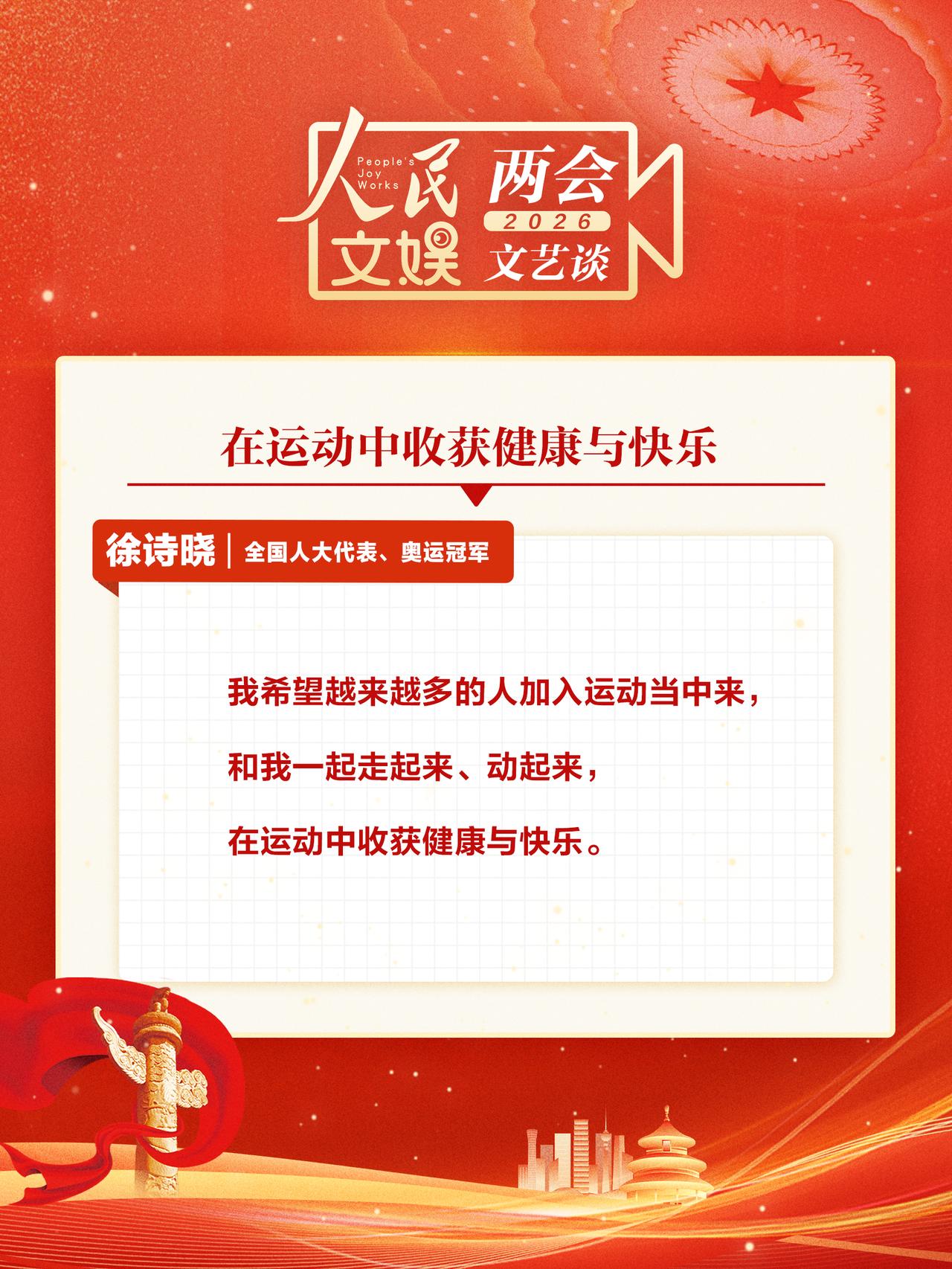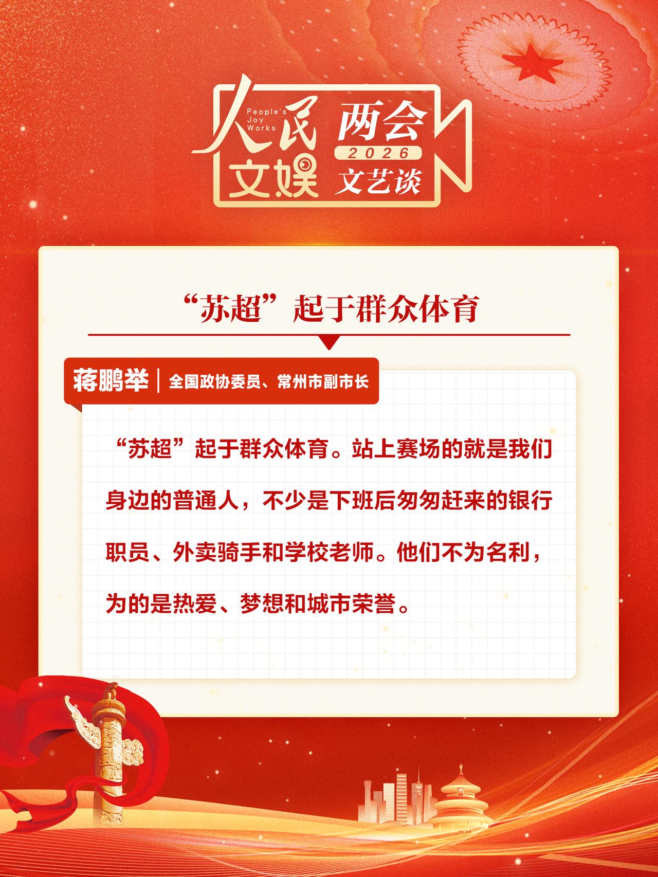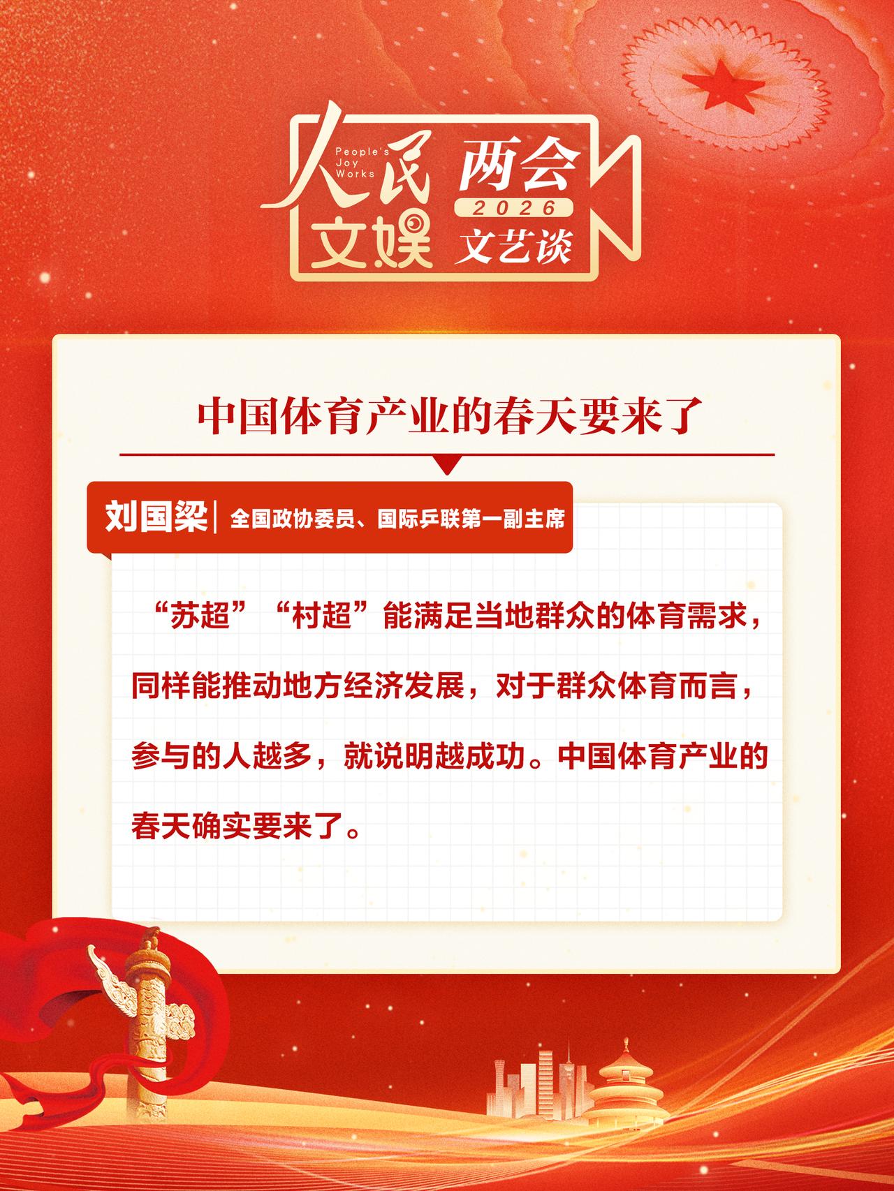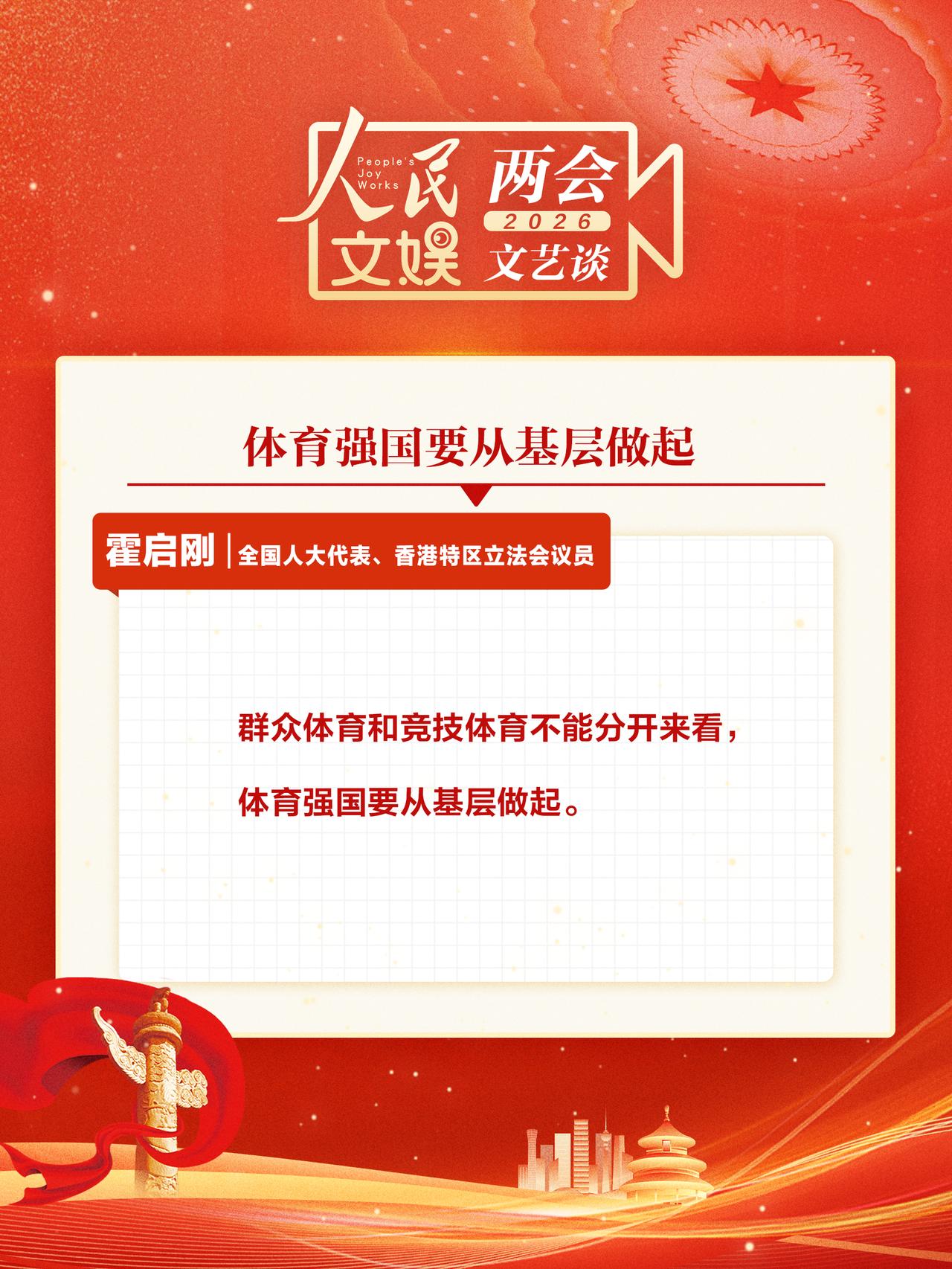 【两会代表委员谈全民体育 】 “村超”“苏超”“厂BA”“浙BA”不断出圈,全民体育成为热潮。全国两会上,蒋鹏举、霍启刚、刘国梁 、张雨霏、徐诗晓等人大代表、政协委员就全民体育发表观点。人民文娱两会文艺谈 全民积极参与,共享体育快乐,活力满满的体育发展画卷正徐徐铺展。