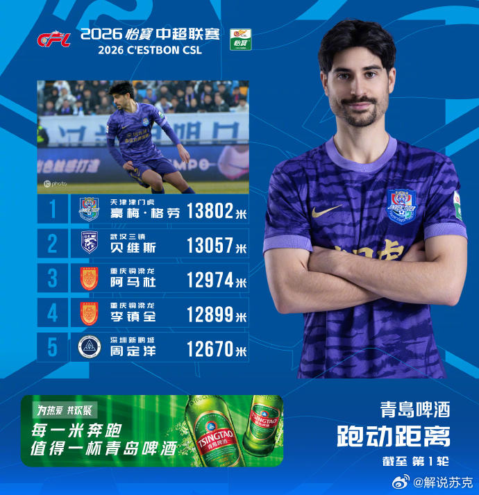 2026怡宝中超联赛 第1轮 跑动距离榜天津津门虎队中场,豪梅格劳,冠绝中超。