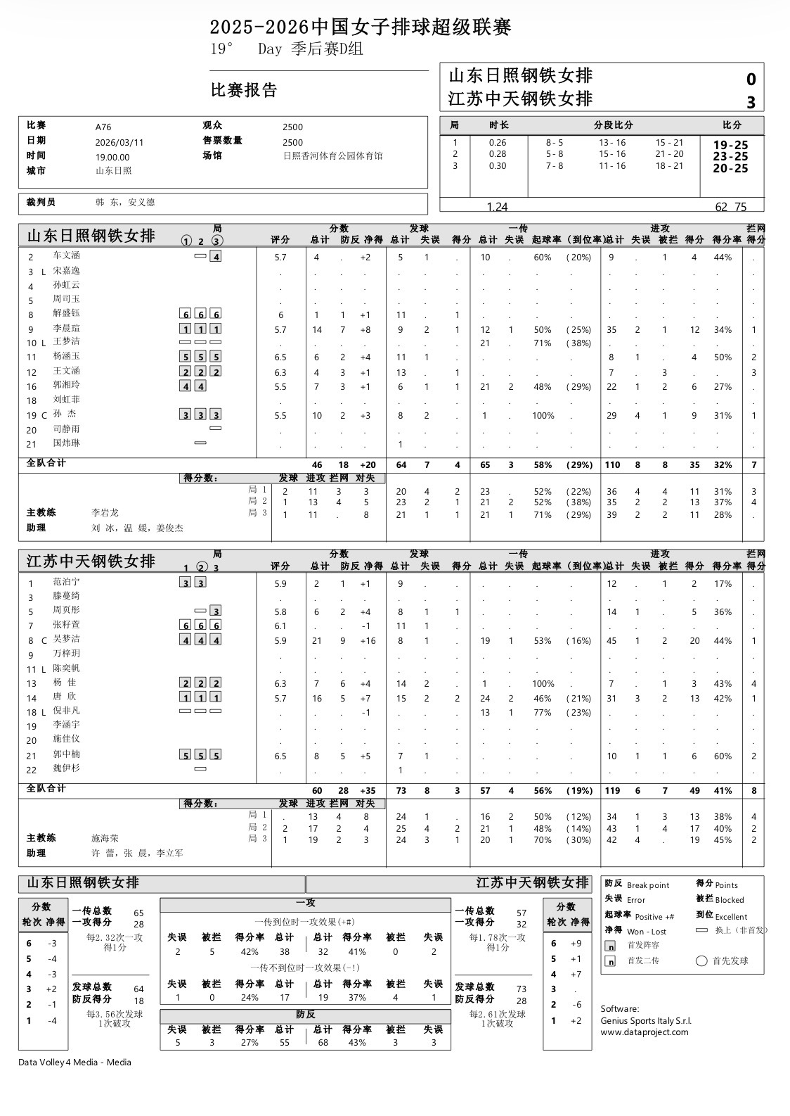 >山东日照钢铁女排:李晨瑄14分、35扣12中2失1被拦、1拦1发孙 杰10分、29扣9中4失1被拦、1拦郭湘玲7分、22扣6中1失2被拦、1发杨涵玉6分、8扣4中1失、2拦王文涵4分、7扣0中3被拦、3拦1发车文涵4分、9扣4中1被拦解盛钰1分、1发