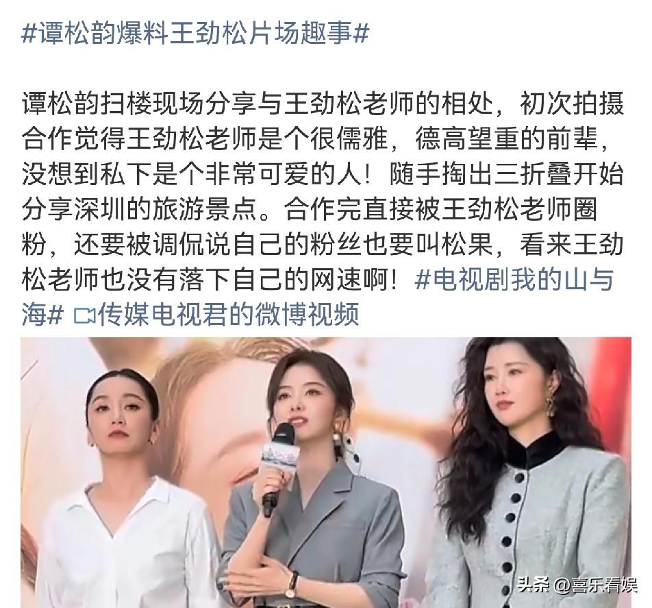 老戏骨王劲松,被谭松韵曝私底下另一面! 3月11日,老戏骨王劲松和谭松韵同时冲上了热搜,不是因为他们在新剧里的表现。 而是,谭松韵最新在出席扫楼活动时,曝出与王劲松合作时,王劲松私底下的另一面。 看的网友感慨道:没想到,王劲松老师台前台后反差感这么大呀! 谭松韵领衔主演的新剧《我的山与海》,现在正在热播。 王劲松老师也参演该剧,在剧中与谭松韵饰演父女。 活动上,谭松韵表示:这是自己第一次和王劲松老师合作,之前就很喜欢他,觉得他是一个比较严肃的一个艺术家。这次与王劲松老师拍戏,更是深刻的感受到前辈对演员这个职业的敬畏之心和真诚。 谭松韵还透露:在喊卡后,王劲松老师就会很儒雅的一个坐在旁边。不仅如此,还有特别可爱的一面,他会翻他的手机,然后说深圳哪里哪里好玩。 被谭松韵问他的粉丝叫什么名时,王劲松老师还对谭松韵笑着称:要不叫“松果”。 知道谭松韵的,大概都会知道,谭松韵的粉丝就叫“松果”,真的没想到,平时看着很严肃的王劲松老师,也是能接梗的。 总之接触下来,谭松韵直言称:之前就很喜欢王劲松老师了,现在更是圈粉了。