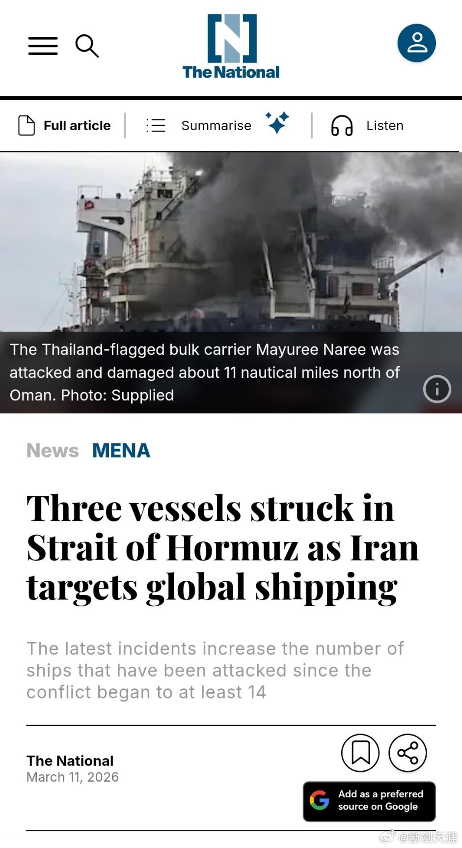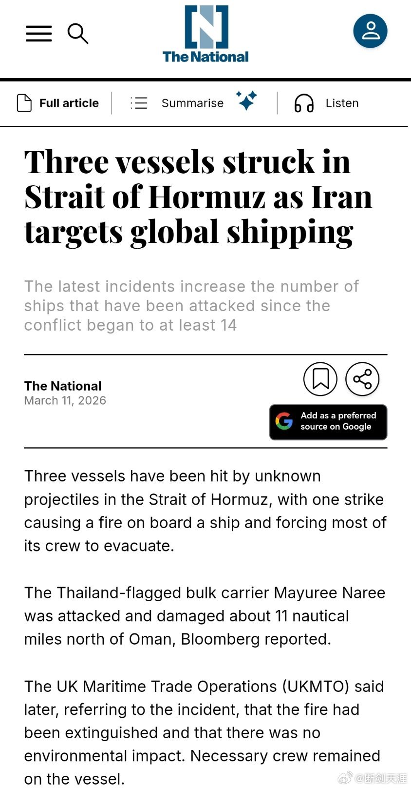 三艘船只在霍尔木兹海峡遇袭,伊朗正对全球航运展开打击。这些最新事件使得自冲突开始以来遭到袭击的船只总数至少达到了 14 艘。