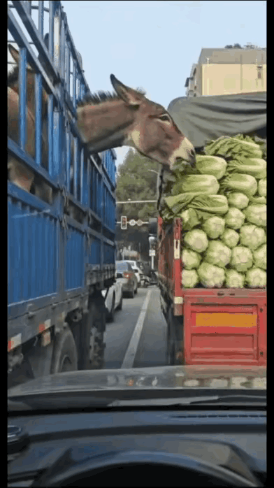 路上等红灯, 旁边车上的驴, 居然偷偷啃起了白菜! 后车司机按喇叭提醒, 这头驴直接开启“怼人模式” 我吃两颗白菜怎么了? 我都快上桌了,按啥按! 网友笑疯:你这头犟驴, 偷吃还理直气壮,服了!