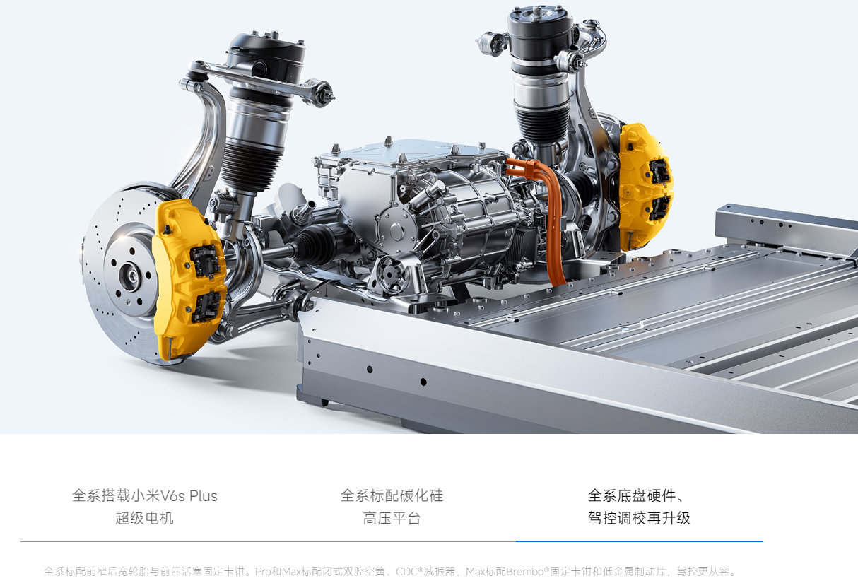 小米SU7最核心的卖点之一就是性能操控,作为云车主对新一代SU7这方面的改进也是十分关注。新SU7在底盘方面,新款Max和Pro版标配双腔空气悬挂+CDC减振器,调教十分出色。