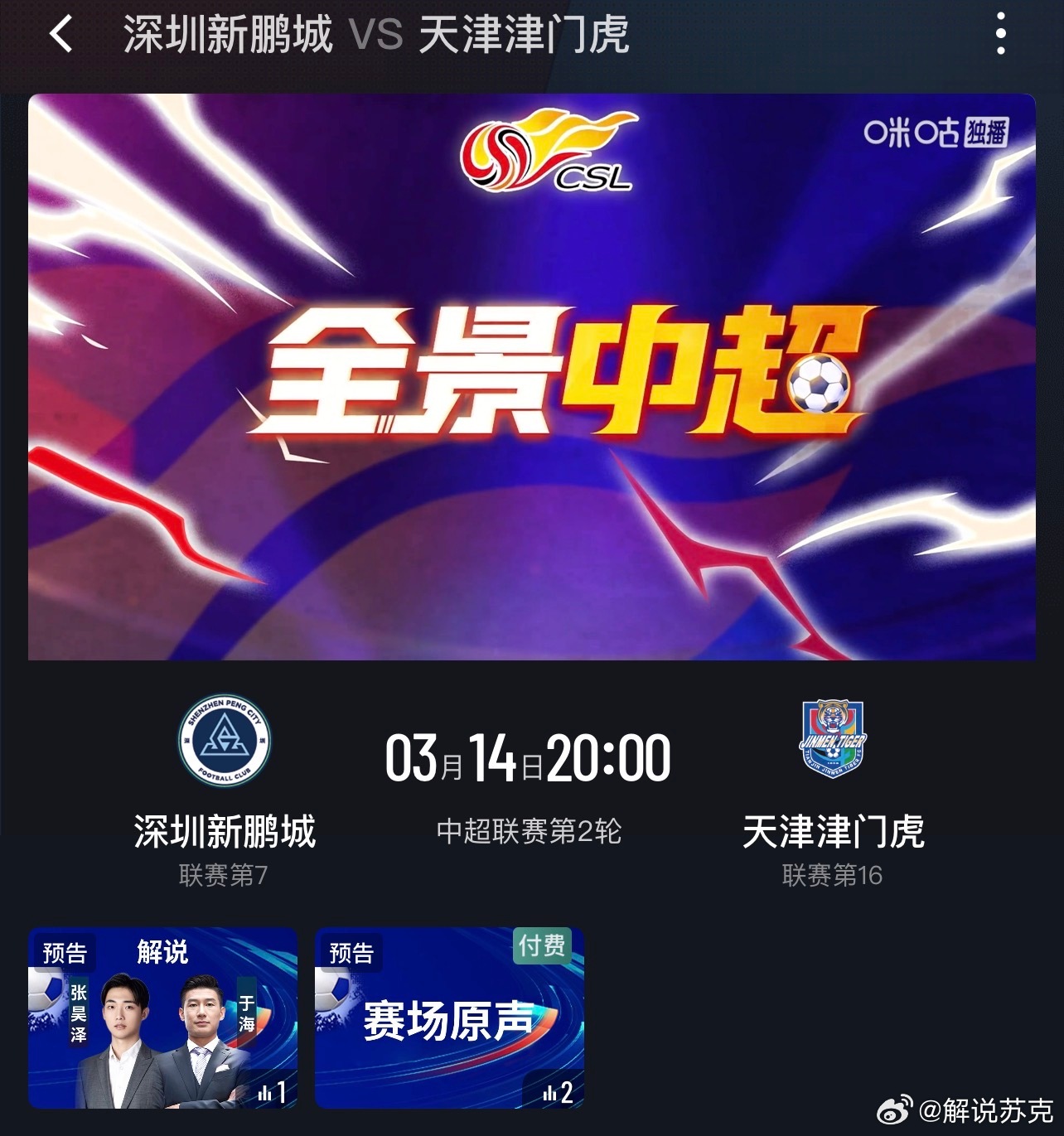 本周中超第2轮,深圳新鹏城vs天津津门虎的比赛,为【免费场】。欢迎老师来解说津门虎,期待刘俊贤登场!!天津津门虎为了天津永远进攻