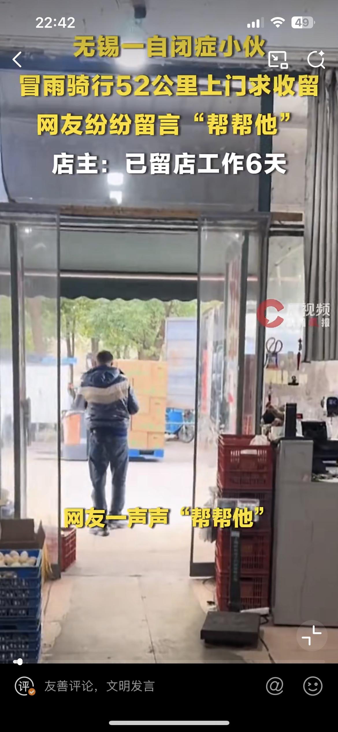 自闭症小伙驱车百里到店求收留,老板娘王女士发视频问怎么办?众多网网友纷纷留言帮帮他,他们在宜兴做鸡蛋批发。原来自闭症小伙在一家超市上班,最近失业了,因为认识这家店的老板江某有给他们超市送货,这个小伙认定江某是个好人,于是就想来投奔他。老板娘王某和老公江某商量了一下。虽然他们店里面生意一般,也不缺人手,但是最终还是想留下这个小伙,给他一个工作的机会。