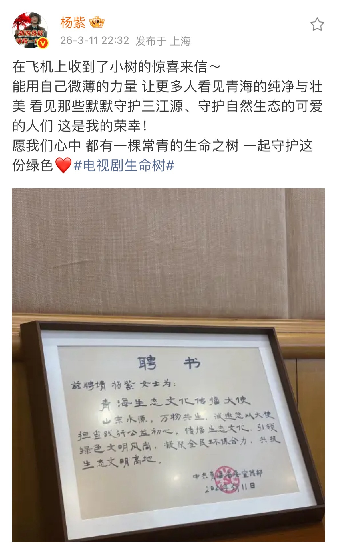 杨紫被聘请青海生态文化传播大使了,生命树的意义又升华了!