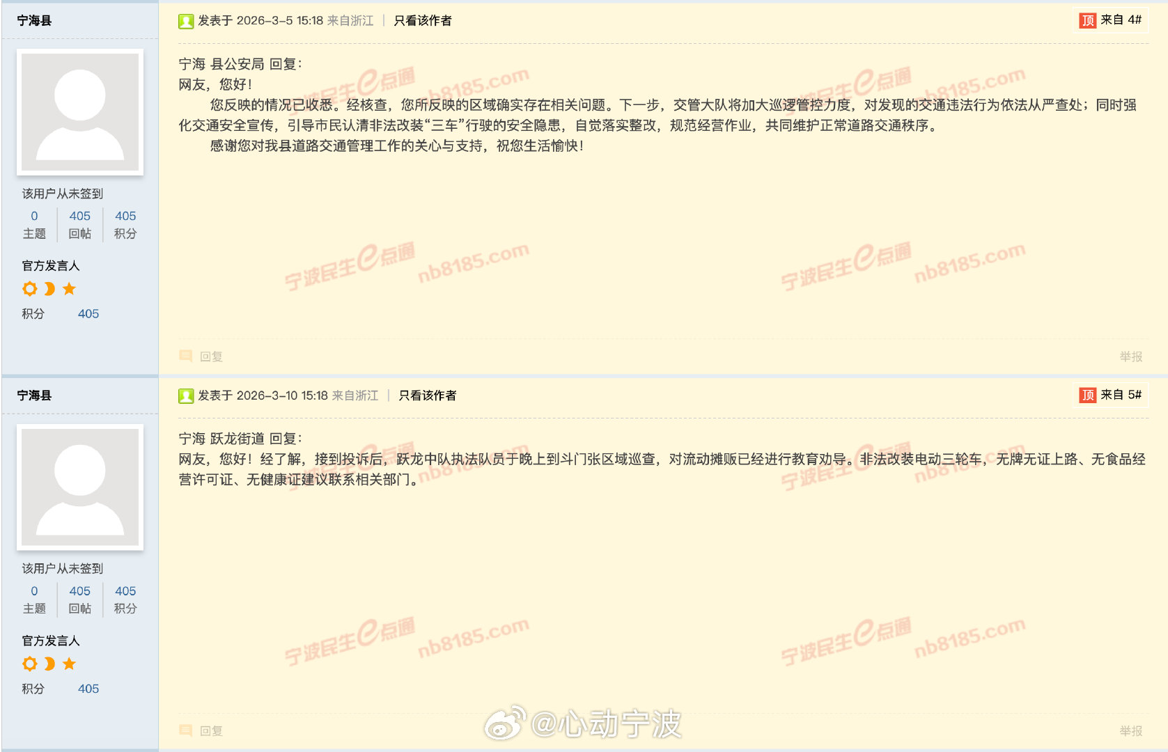 3月5日,宁海县公安局回应表示,已核查确认相关问题,交管大队将加大巡逻管控,对交通违法行为依法从严查处,同时强化交通安全宣传,引导经营者规范作业,维护道路交通秩序。3月10日,宁海县跃龙街道回复称,执法队员已夜间巡查并对流动摊贩开展教育劝导,针对非法改装、无牌无证、无食品经营许可及健康证等问题,建议由对应职能部门处置。