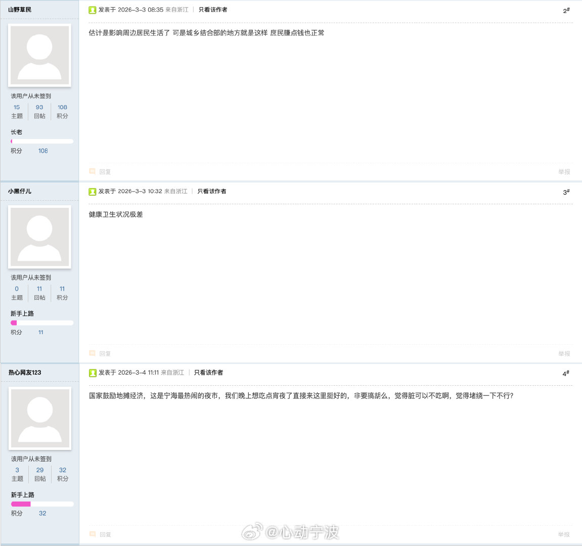 此事引发网友热议。有网友认为,摊贩影响居民生活,且健康卫生状况极差;也有网友表示,斗门张是宁海热门夜市,满足市民宵夜需求,地摊经济应予以包容,觉得脏乱或拥堵可选择避开;还有网友提及,城乡结合部摊贩谋生不易,治理需兼顾民生。