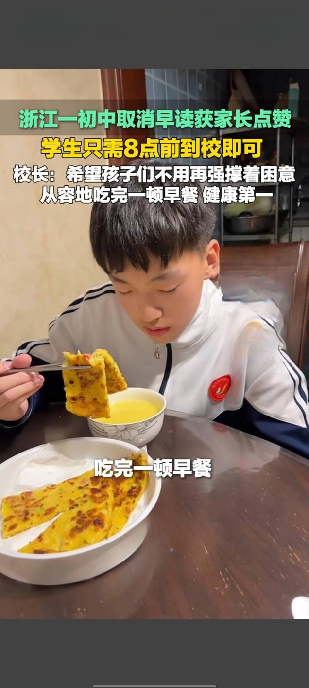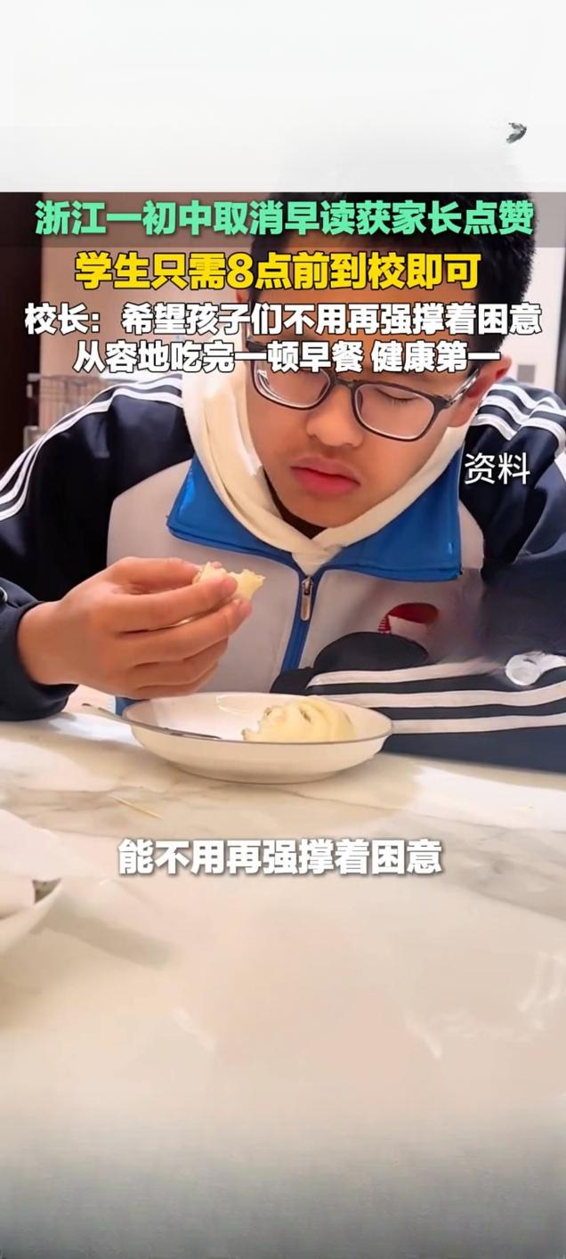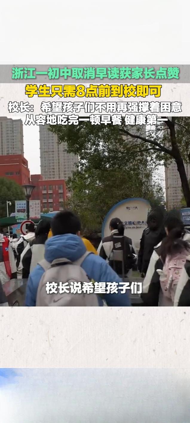 浙江一初中取消早读获家长点赞 8点前到校让学生从容开启清晨 近日,浙江宁波前湾新区初级中学推出新举措,正式取消每日7:30至7:50的早读时段,学生只需在8点前到校即可,这一做法收获家长广泛点赞,相关内容在快手平台播放量达1443次。 该校校长表示,调整的初衷是让孩子们不用再强撑困意匆匆上学,能从容地吃完一顿早餐,同时也让教师以更饱满的状态投入教学,此次调整也是响应教育部“健康第一”的工作部署,切实改善学生睡眠状况。 为打消家长对学习时间减少、早到学生管理的顾虑,学校制定了完善配套方案。原早读时段整体平移至下午3:30至3:50,教师将读背任务细化落实并同步家校群。学校还实行弹性错峰到校,早到学生可观看《朝闻天下》了解时事,校园也向家长开放,支持亲子晨跑锻炼。 家长们纷纷表示,取消早读后孩子睡眠更充足,起床气消失,晨起节奏变得从容,亲子关系也更为和谐,学生上课的专注度也有明显提升,真正实现了减负不减质。取消早读