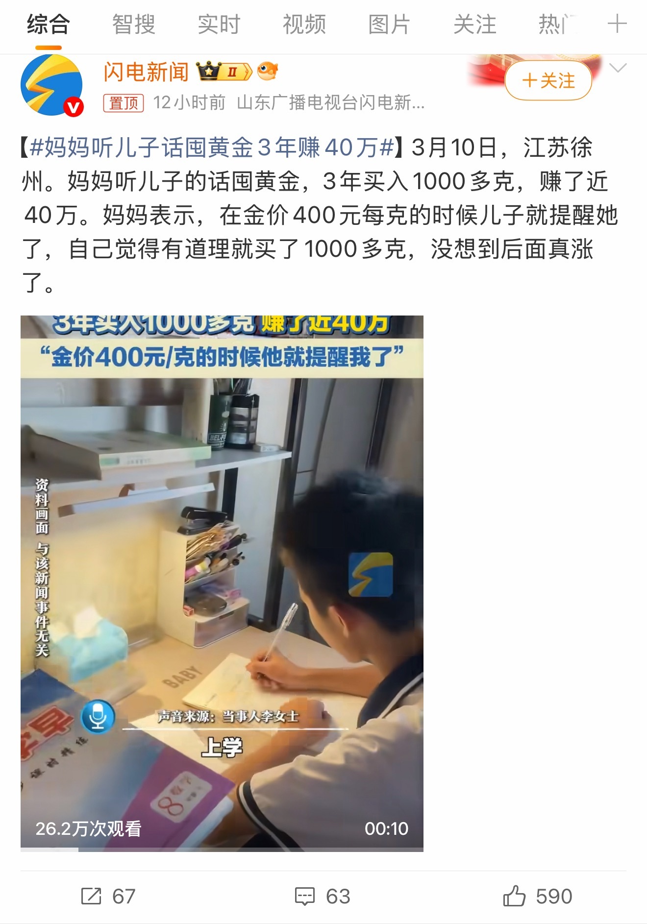 妈妈听儿子话囤黄金3年赚40万这事最有意思的不是40万,而是两点:第一,这妈妈真