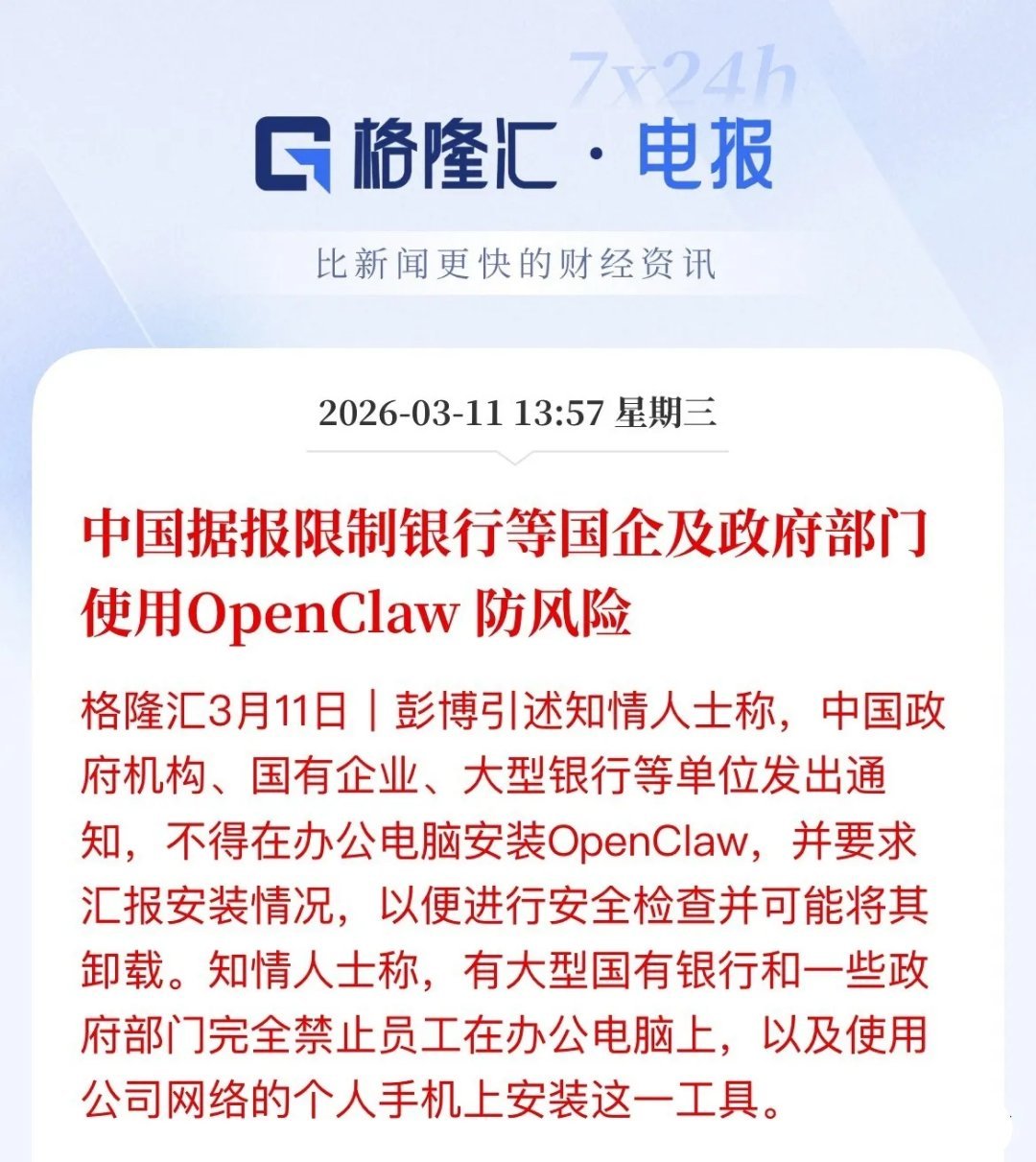 这是一条跟前一条文章有重要关联,谨慎而行!防范风险,还指数概念,虽然落地,但并没有真正完善,在外面的消息总是比在里面的人来的灵通,报道说中国政府机构、国有企业、大型银行等发出通知不得在办公电脑装OpenClaw在3月官方已经有工信部、国家互联网应急中心、中国通信院专家安全风险通知,核心是审慎使用、严格防护,明确四大核心风险为:提示词注入、误操作破坏、插件投毒以及高危漏洞和配置脆弱。