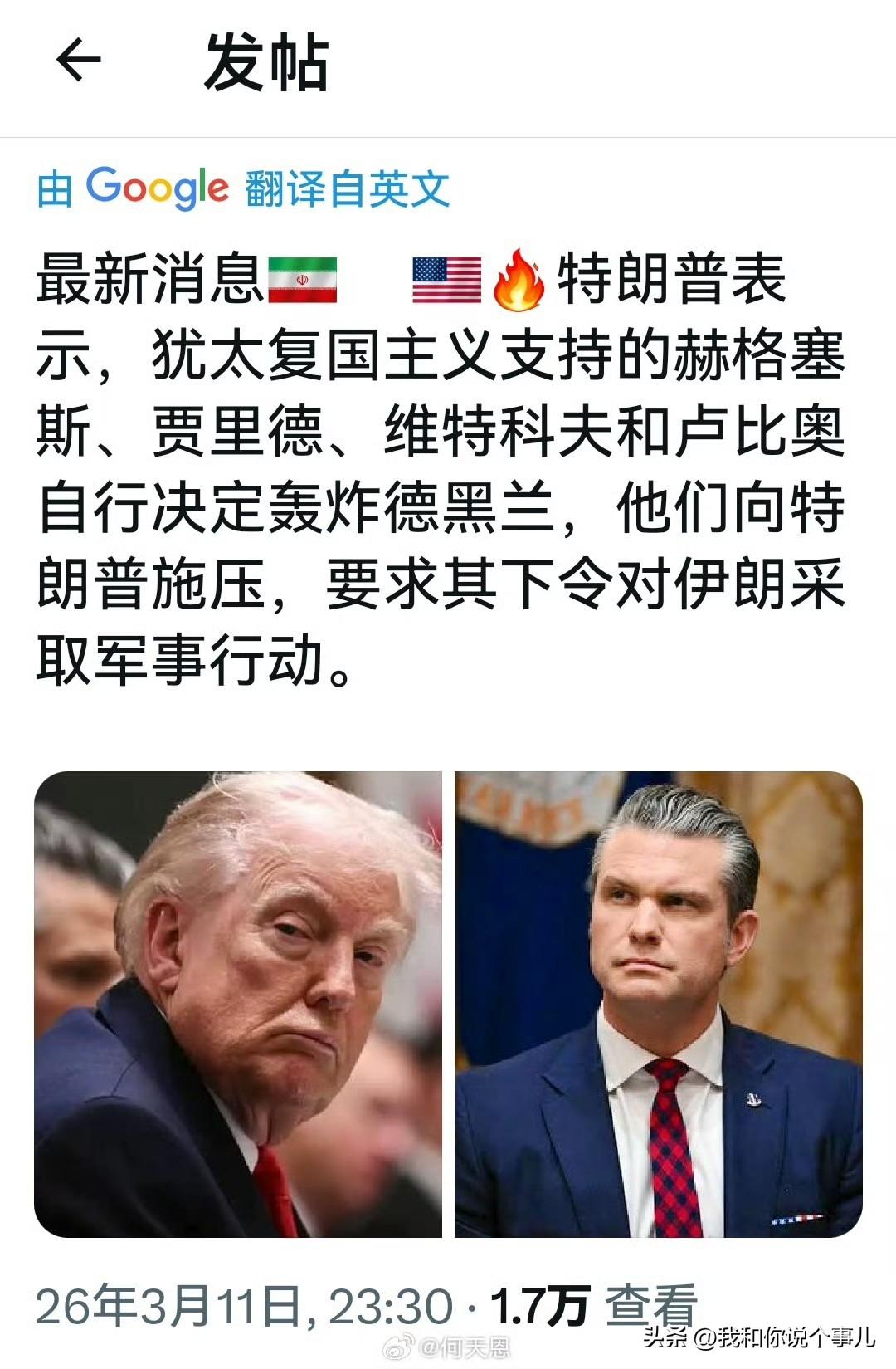 最新消息: 特朗普表示,犹太复国主义支持的赫格塞斯、贾里德、维特科夫和卢比奥自行决定轰炸德黑兰,他们向特朗普施压,要求其下令对伊朗采取军事行动。 什么情况?“自行决定轰炸德黑兰”、“向总统施压”,怎么个自行法?战争是这几个自行实施的,和你一点关系都没有是吗?甚至演绎为“绕过总统自行决策”,看看这几个人的身份: 赫格塞斯:即美国国防部长 贾里德:特朗普女婿、前白宫高级顾问 维特科夫:特朗普政府中东问题特使。 卢比奥:时任美国国务卿 感觉不太可能!难道赫格塞思、贾里德、维特科夫和鲁比奥这几个厮竟敢挟天子以令诸侯,再说敢作敢当的特朗普总统应该不会成为他们的玩偶挡箭牌吧?或者是中期选举形势不行了,特朗普想甩包找替罪羊 所以,伊朗战争失败的责任不在总统本人,而在其他几人? 注:本文信息源于网络,内容仅为个人观点,无不良导向。