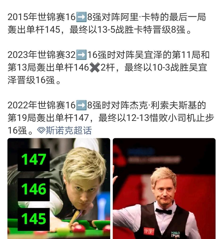 可惜没有中国球员在克鲁斯堡打出单杆147,今年有希望吗?在世锦赛正赛期间共有11位选手在克鲁斯堡打出15杆满分147分,火箭与亨得利均打出3杆。 尼尔·罗伯逊是斯诺克世锦赛历史上唯一一位在克鲁斯堡剧院打出过145分、146分和147分单杆破百的选手。