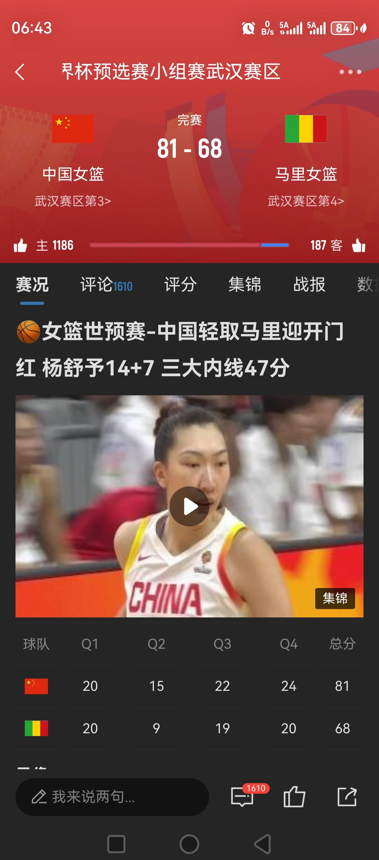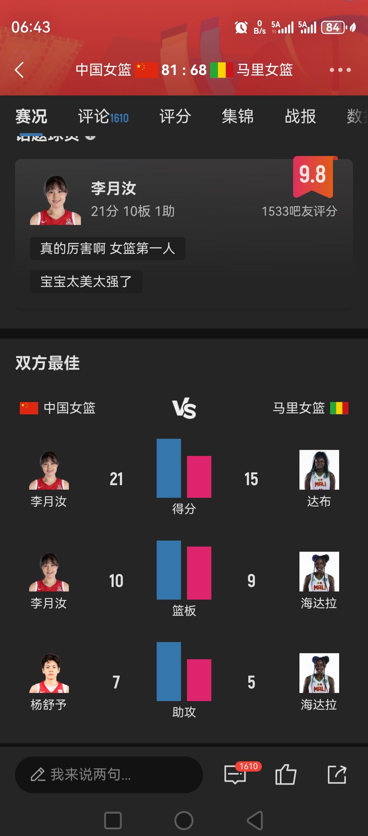 中国女篮开门红!内线确实是世界级的!李月汝21分10板,韩旭和张子宇都得分上双!马里队确实防不住! 之前刘禹彤的落选确实可惜,也没办法,内线只能带三个,跟这三个比,她确实也没优势。就是张子宇,那高度,也是无可取代的,关键时刻,特定时间,会有大用处! 昨晚第三节,就是靠张子宇拉开的比分! 后卫王思雨,杨舒予也不错,陈玉捷,张曼得分不多,但有些防守的作用,数据体现不出来! 大前锋罗欣棫,唐子亭也不错! 不足,失误太多,多次空篮不进,三分也需要提高! 但,拿下开门红!挺好![赞][赞][赞]