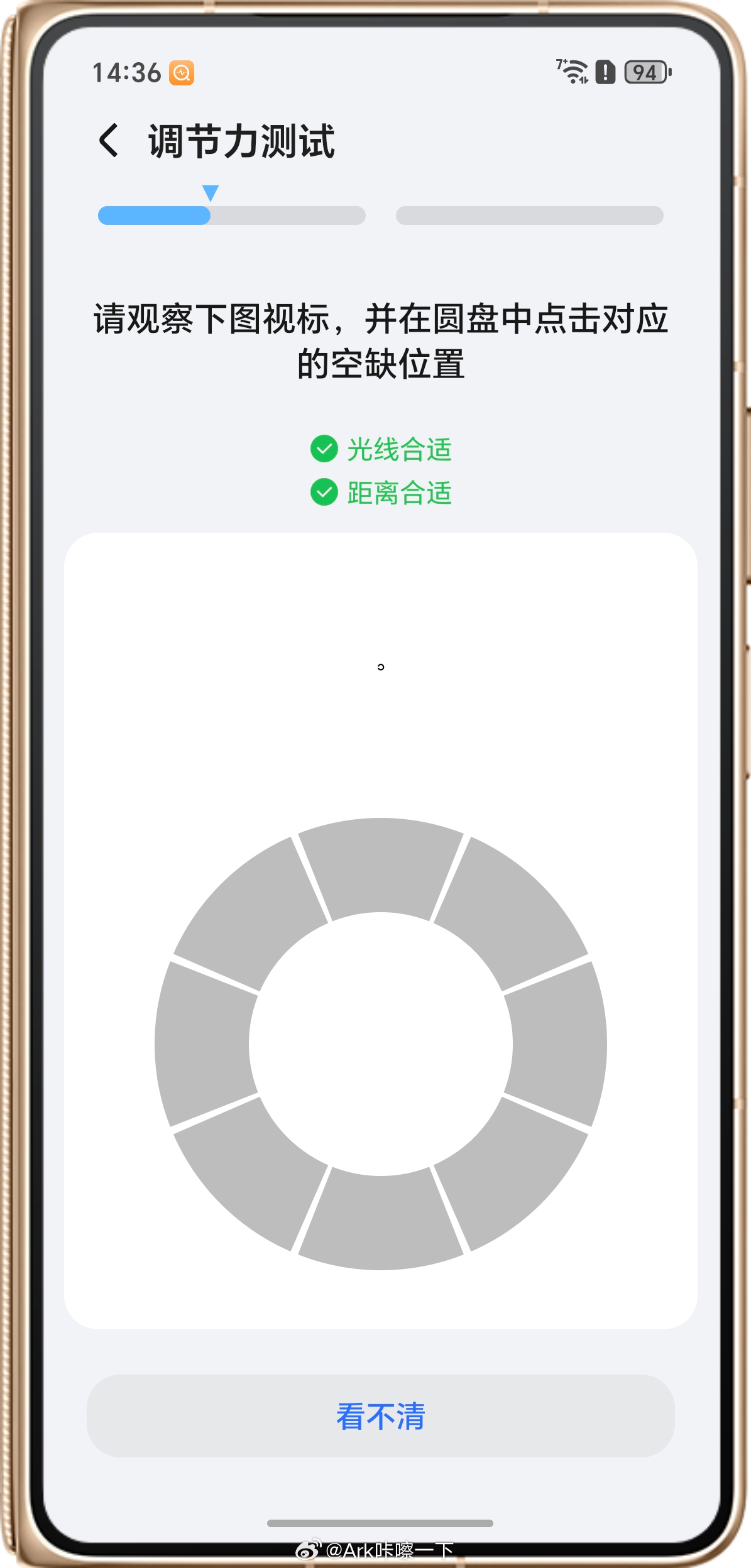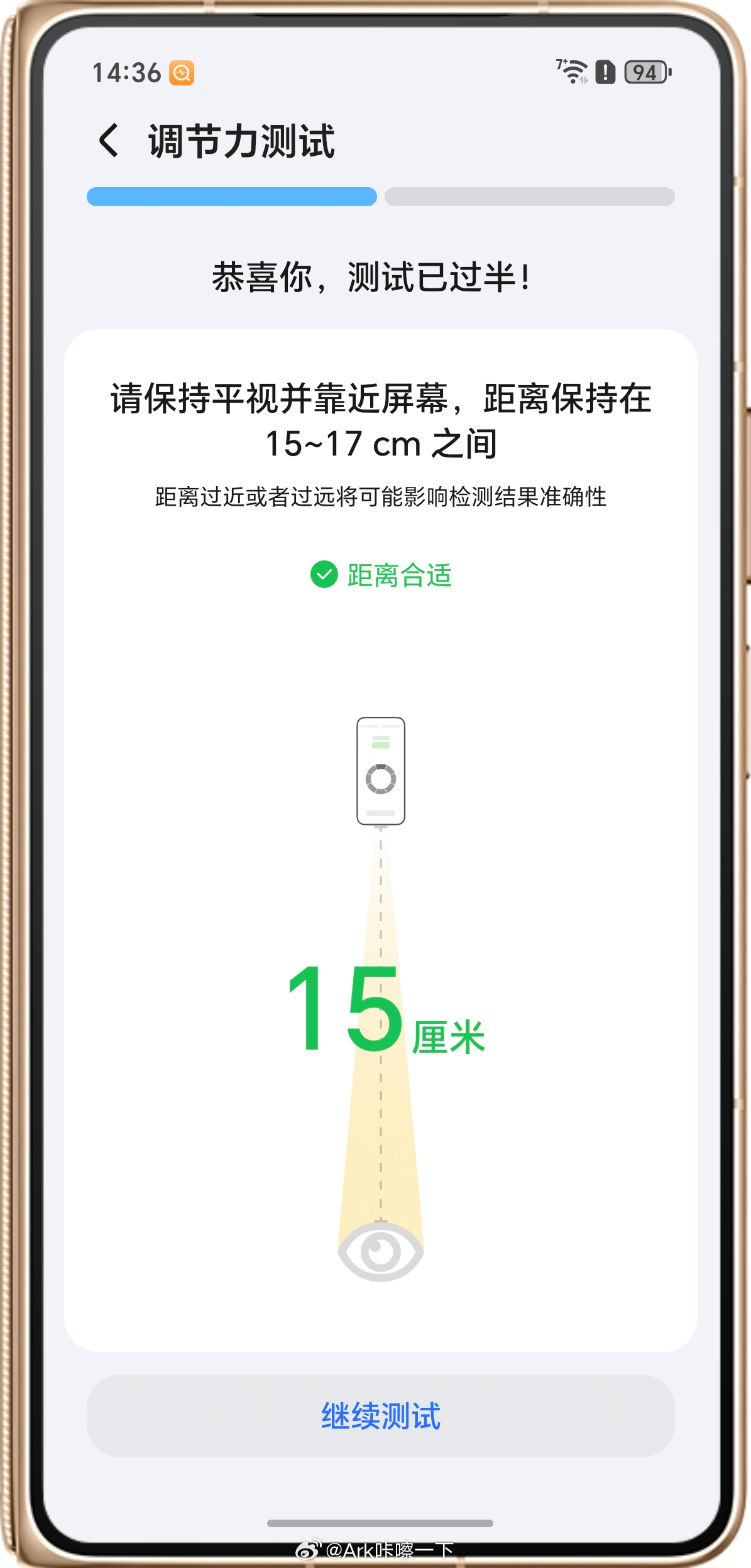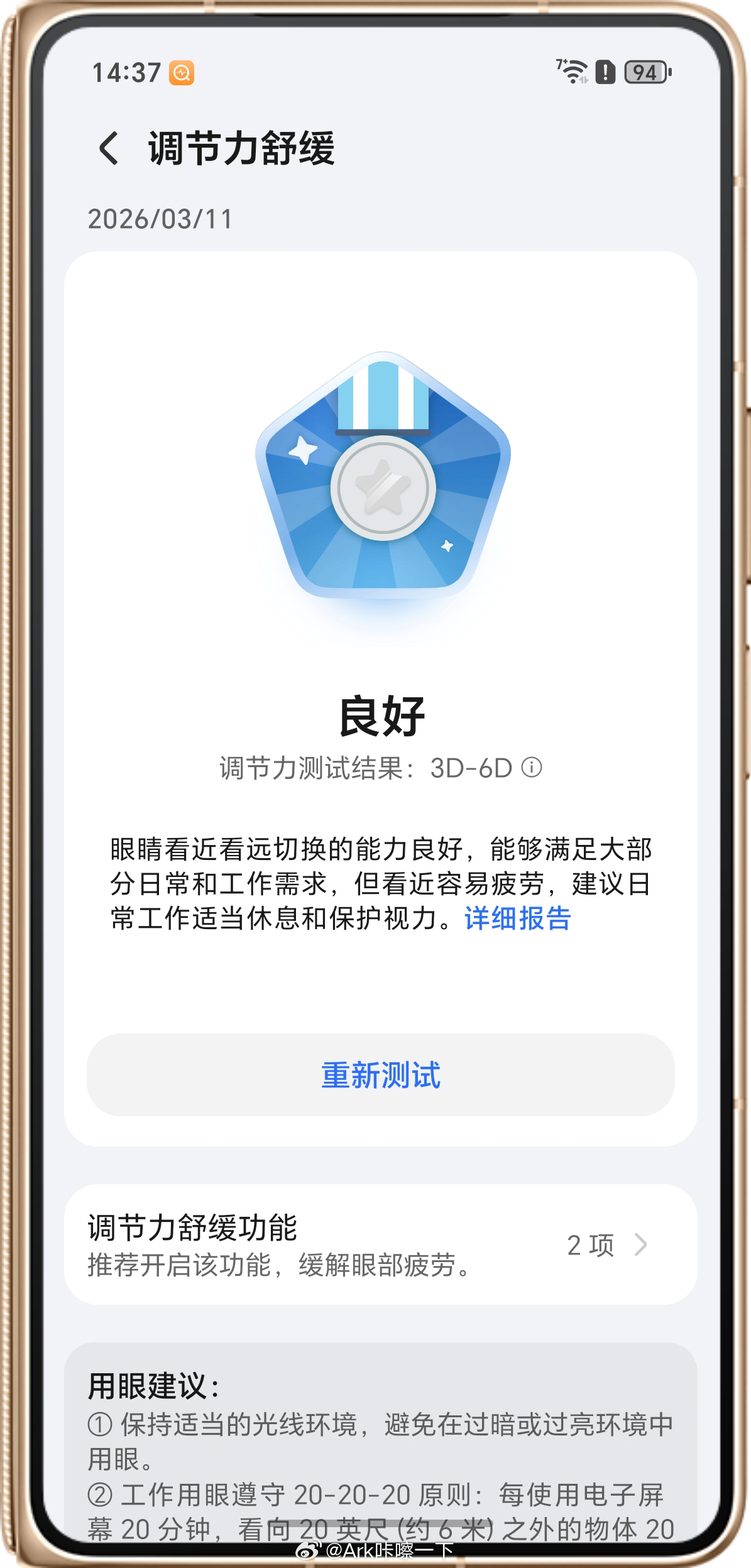 早鸭!荣耀Magic V6还首次带来了远近视调节测试,通过不同距离测试你眼睛看屏幕的清晰能力,结合用眼监测可以更好地让我们注意用眼健康问题。