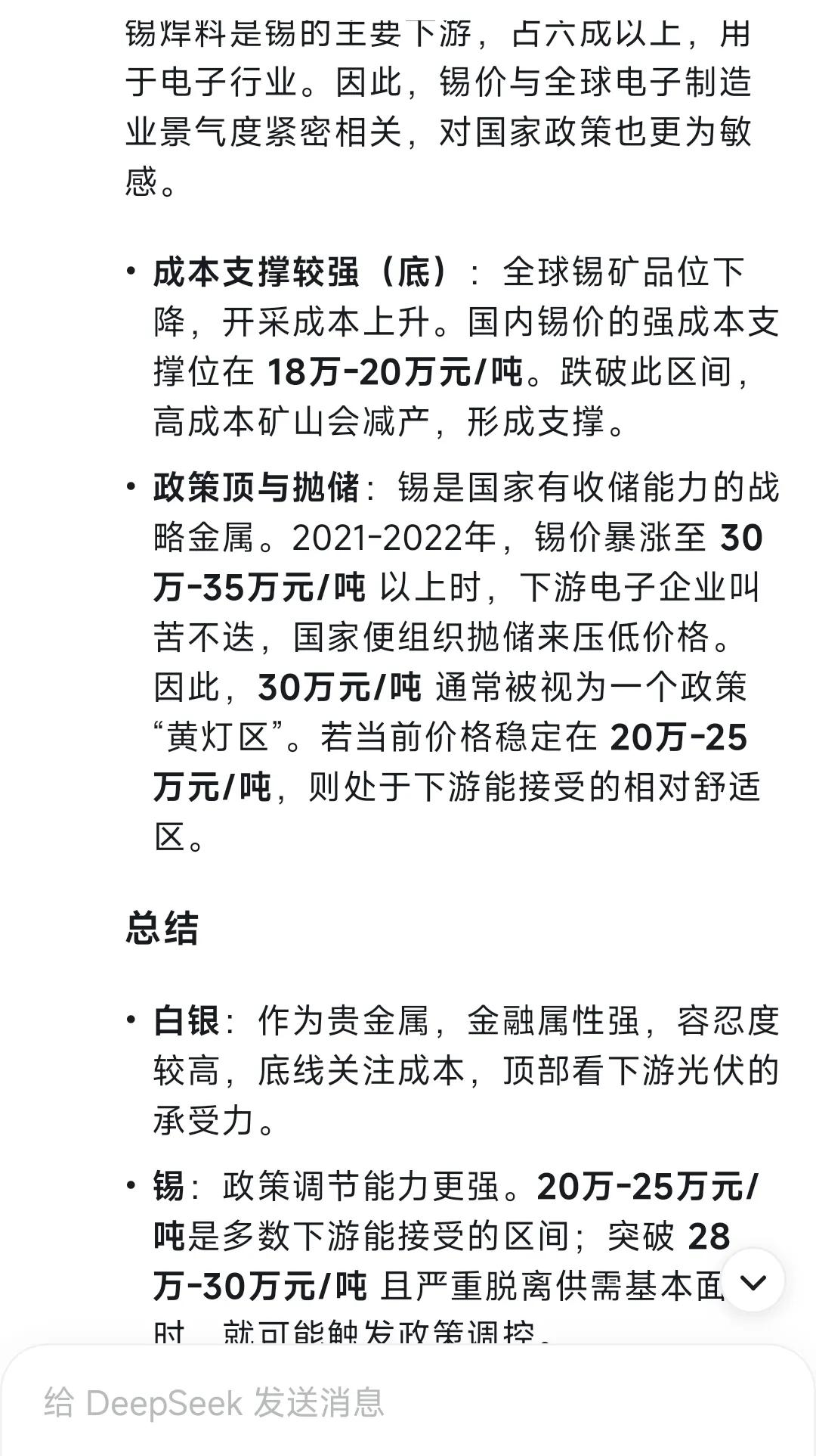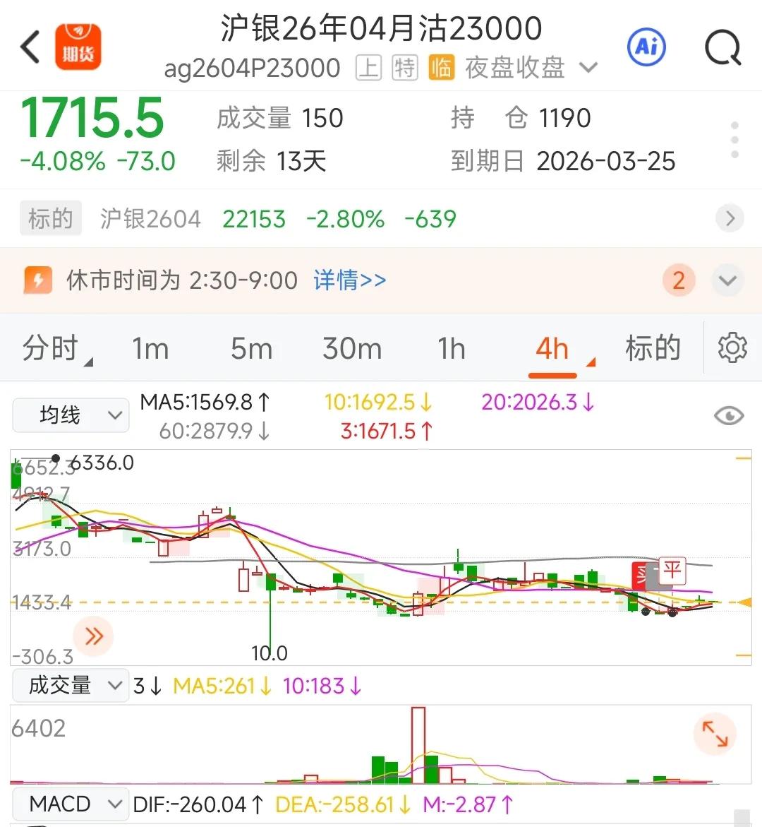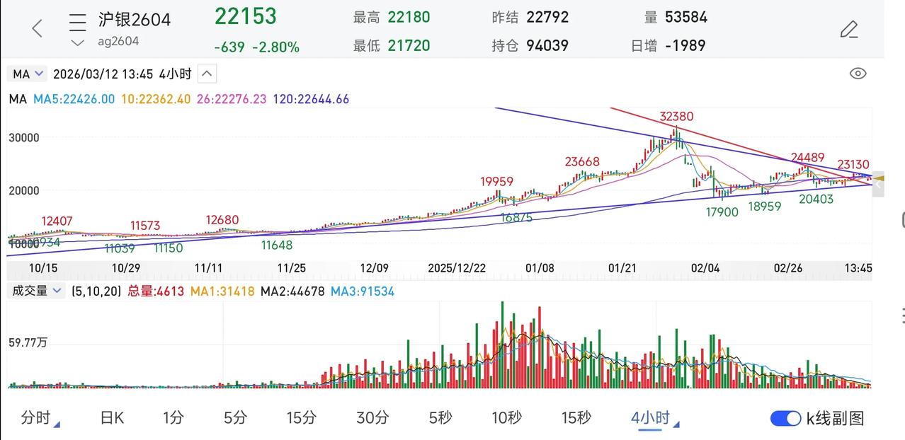 做t卖飞了,前天下午到压力线上不去,买了看跌23000,外盘下去又回来了,错失机会,卖出后一度降了100左右没接回来,想等更低点,嗯,结果一路上去了,白银太妖,不敢长拿 看走势有可能大涨后再大跌。从21年锡和白银大涨后摁挺可以看出,监管不希望原材料涨幅过高压制产业发展,锡有国家库存,11年直接释放流动性,去年年底更是直接涨幅不大时直接限制开仓手数可以看出锡容忍度更低,因电子产业焊接离不开。目前大力发展ai产业,锡银不可能让其暴涨的,我问了AI监管容忍边界,发现锡银目前均远高于黄灯区,所以外盘降手续费后国内仍继续限制,长期回归是大势所趋,但短期仍可能会受刺激上窜,为安全起见,只做高空,不做低吸,虽然前几天感觉要大拉,不敢,怕挂山顶。银以4h做趋势比较舒适,但期货太贵,重仓容易爆仓,虽然期权赚的少,但相对安全