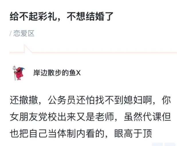 彩礼负担大,这种情况应该放弃结婚吗? 今天的热议来自一位网友的分享: 楼主是公务员,经同学介绍认识了代课老师女友。女生叔叔是副处级领导,也许会对楼主工作有帮助。最近与女友谈到结婚话题,女生要求彩礼加三金总共25万+,并且愿意买房子时出首付的大头,装修需要楼主再贴点。楼主觉得彩礼金额太多会掏空家庭,于是产生了放弃结婚的想法。 你怎么看?
