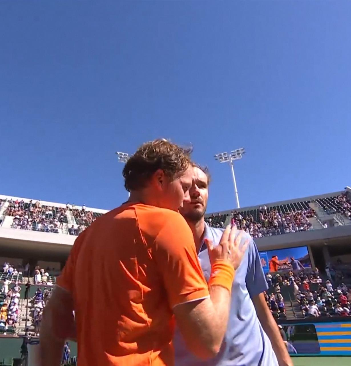 梅德韦杰夫印第安维尔斯大师赛横扫米克尔森 ,强势晋级八强 北京时间2026年3月12日凌晨,印第安维尔斯大师赛1/8决赛,梅德韦杰夫对阵米克尔森。 结果, 梅德韦杰夫直落两盘,以6:2、6:4的比分横扫米克尔森,强势晋级八强。 第一盘。第三局,梅德韦杰夫直落四分破发,2:1。第五局,梅德韦杰夫逼出连续两个破发点,成功破发,4:1。第八局,梅德韦杰夫发球胜盘局, 仅丢一分,顺利保发。6:2 ,梅德韦杰夫拔得头筹。 第二盘。一上来,梅德韦杰夫连破带保取得2:0领先。第十局,梅德韦杰夫经历四个平分,化解两个破发点,顽强保发。6:4。 由于这场比赛的胜利,梅德韦杰夫将自己与米克尔森的交手战绩改写为3胜0负。
