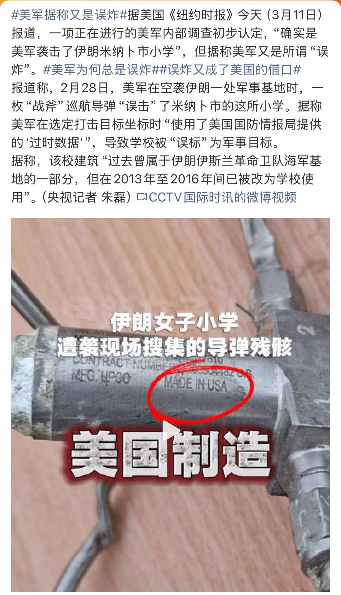 面对美国空袭轰炸了伊朗小学并造成100多名儿童死亡的指控特朗普第一次说是伊朗干的在被媒体拍到是美军使用的“战斧”时特朗普说伊朗也可能有“战斧”在被发现现场爆炸碎片上明确写明“made in usa”的时候,又开始说是误炸了对伊朗领导人精准斩首的时候,特朗普可是说过美以有精准的人力和技术情报,所以误炸这个理由,完全不可能成立。美军据称又是误炸分析称美国可能真的有点撑不住了热点观点 美军据称又是误炸