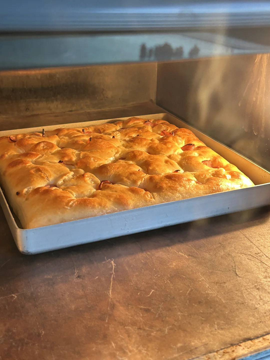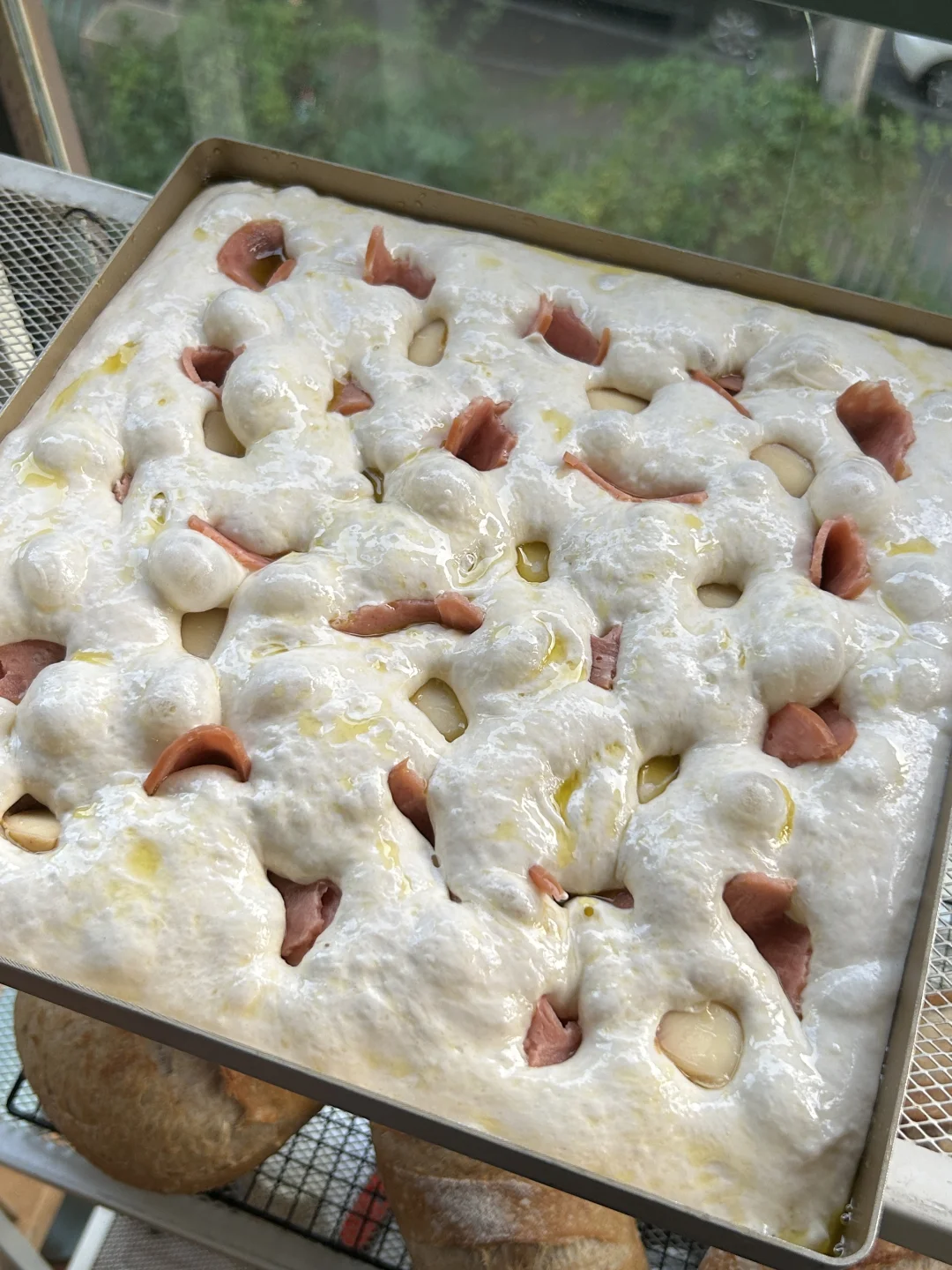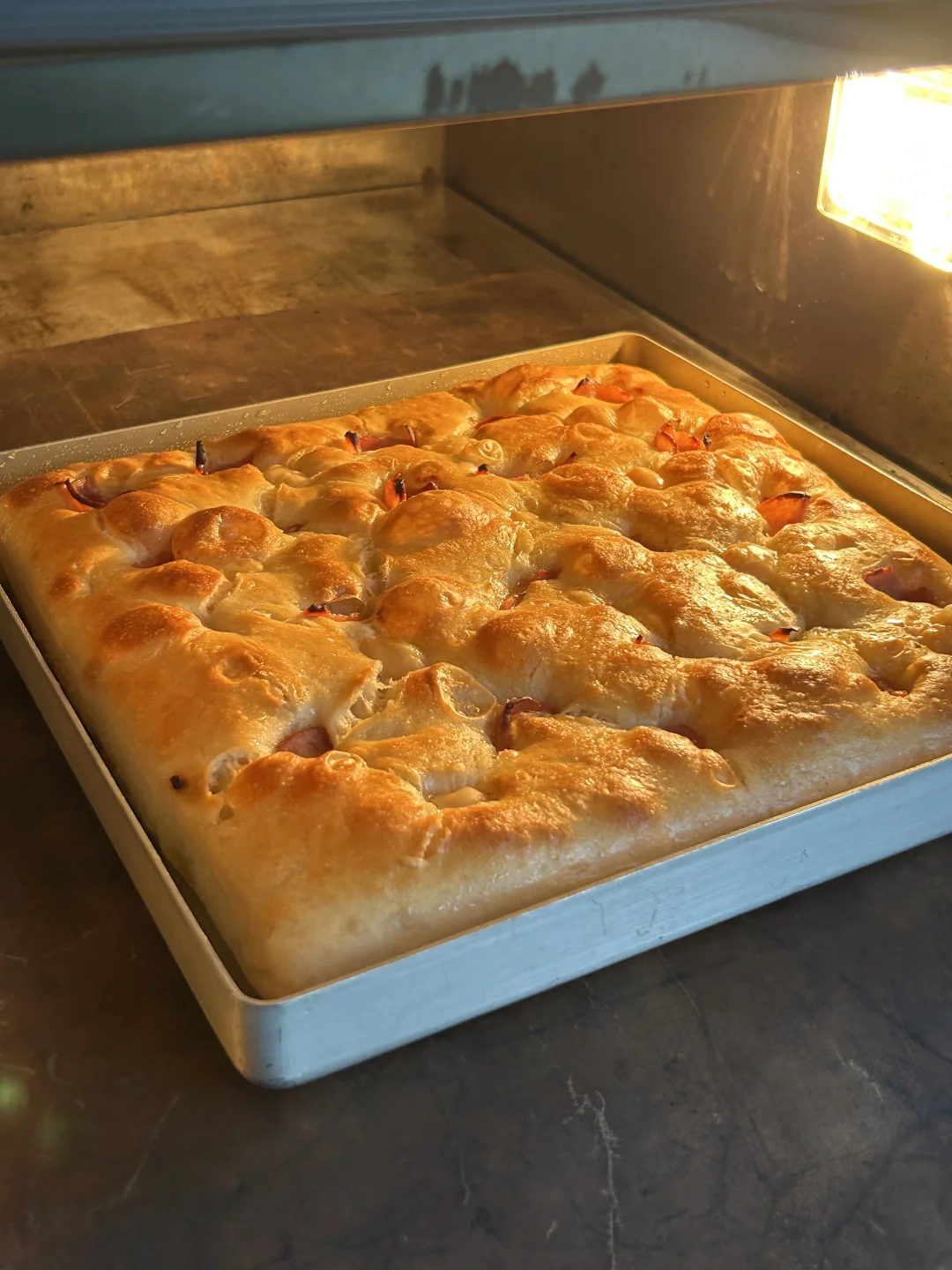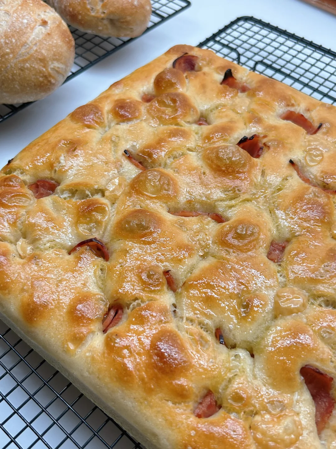 法式 T55 面粉,加了点儿鹰嘴豆粉(10%) 大概 85% 水量 无需机器打面,也不松揉,混合好以后水合, 拉伸折叠几次,摊在烤盘中隔夜冷藏发酵, [烟花R]入炉前按压了一些香肠片和芝士块进去, 230℃ 上下火,[星R]入炉打蒸汽, 20 分钟出炉。 [太阳R]意外的好吃,没有机械打面那种韧韧的外壳,反倒是油酥皮和软糯多孔。 即使是夹三明治也不会露馅儿。 相当好吃,值得一试🤓