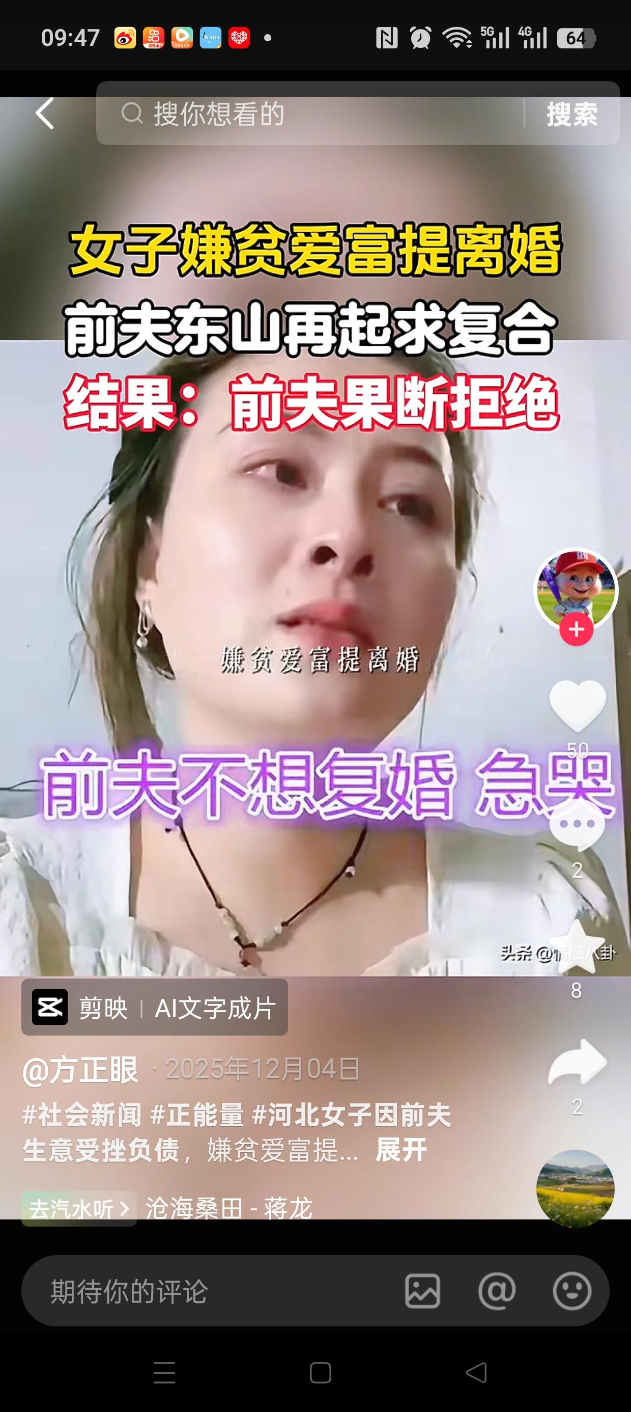 有些女人这辈子,最后悔的事儿就是太会算计了!算计来算计去,把真心待自己的人算计没了,回头再想捡起来,门儿都没有。 河北就出了这么个真事儿,听完你就知道,什么叫把人性的凉薄演了个透。 这女的,当初嫁的男人是个靠工程吃饭的包工头。那几年活儿多,手头宽裕,家里日子过得滋润。老公对她也是真舍得,好吃好喝供着,百依百顺哄着。可干工程的都知道,这行就像坐过山车,有上坡就有下坡。后来一个项目出了岔子,资金链断了,窟窿堵不上,房子车子全填进去了。一夜之间,从宽敞亮堂的大房子,搬进了月租几百的出租屋。 这时候,这女的脑子转得比谁都快。她没想着帮男人扛一把,没想着说几句暖心话,直接甩出一句:离婚。她觉得自己才三十出头,模样也不差,离了这个穷鬼,随便找个有钱人照样过好日子。前夫跪下来求她,孩子哭着拽她衣角,她眼皮都没抬一下,拎着箱子就走了。 后来的日子,替她把这笔账记得清清楚楚。 她确实在外头周旋过几个男人,可人家都是跟她逢场作戏,打发时间可以,娶回家?没人愿意。晃荡了两年,啥也没捞着,最后只能去干零活,起早贪黑,挣那点辛苦钱。这时候她才反应过来,当初那个把她捧在手心里的男人,是多稀罕。 巧的是,前夫那边熬过来了。之前的工程款结清了,债还完了,还买了大平层和新车,日子比以前还风光。她一听这消息,心里那团火又烧起来了。收拾行李就找上门,见了面二话不说,扑通一声跪地上,眼泪一把鼻涕一把,说当年是自己不懂事,求前夫给她个机会,一口一个老公喊着,就想复婚。 前夫站在门口,脸上那个不耐烦,隔着屏幕都能感觉到。他压根不接这茬,直接告诉她,两人早就离了,没关系了,别在这儿装可怜。她还是不走,跪在地上抱着大腿哭。前夫被磨得实在没招,从兜里掏出一千块钱扔她面前,嘴里蹦出八个字: 日落西山你不陪,东山再起你是谁? 这话像一盆冰水,浇得她浑身透凉。视频传到网上,评论区一边倒支持前夫。大伙都说,当初人家最难的时候你跑得比兔子还快,现在看人家有钱了又回来跪着求,天底下哪有这么便宜的事儿。 说到底,婚姻这回事,最怕的就是只能同甘,不能共苦。你落魄时我守着,我风光时你跟着,这叫夫妻。你落难时你甩开我的手,你翻身时你又来扒我的门,这叫算计。 这女的,亲手把那个真心对她的人推出了门,往后的日子,只能在后悔里熬着。而前夫的拒绝,不是心狠,是清醒。他把那个只想沾光的她请出自己的生活,也是在守住自己的清净,守住自己应得的日子。