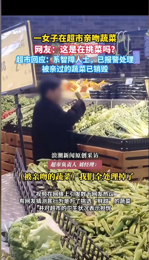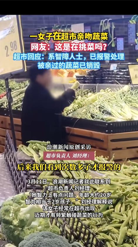 “这菜不能要了!”近日,江西,一女子在超市生鲜区,拿起货架上的蔬菜就亲了起来,两头反复亲了好几次后,又把它放回了货架。随后,女子又拿起另一颗蔬菜,重复了起来。这一幕被热心网友看见,拍了视频发到了网上。网友:挑选蔬菜新方法? 据媒体3月11日报道,事发当日,林女士(化姓)正在超市购物,在经过生鲜区时,就看到该女子正在糟蹋蔬菜,因为之前也撞见过,这一次就拍了视频。 超市管理人员在了解到情况后,就报了警。经过调查,这名女子今年20岁,智力有些问题,只有2岁小孩的水平。以前也经常来超市,最近才发现有碰蔬菜的行为。 警察已经联系了女子的家长,让他们把人带回去了,也已经教育了监护人,要好好进行照看。至于被女子亲过的蔬菜,超市也进行了销毁,大家不用担心流入市场。 超市经理说,考虑到女子的实际情况,他们也没有管家属索要赔偿,只是希望平时家长能多管管,他也跟消费者做了保证,以后会加强超市的管理,避免再发生这种事情。 网友看后表示,残障人士平时一定要好好看护,怎么能让他们单独出门呢?亲蔬菜这件事,本身就牵扯到卫生安全,要是女子一个人再出现些什么意外,岂不是更加悲剧!这种事情,监护人绝对不能够逃避! 信息来源:《一女子在超市亲吻蔬菜, 网友:这是在挑菜吗?超市回应:系智障人士,已报警处理,被亲过的蔬菜已销毁》浪潮新闻