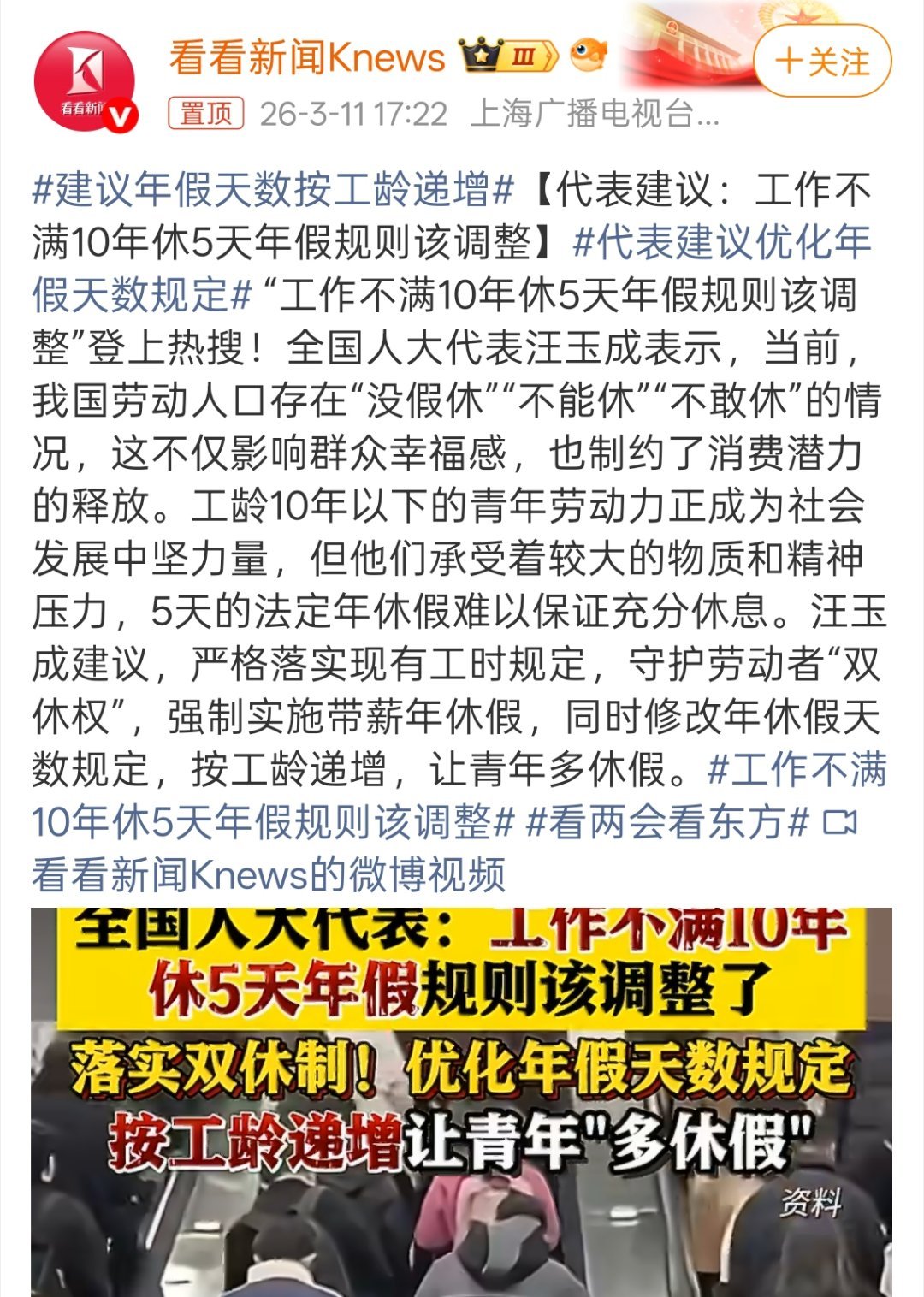 建议年假天数按工龄递增按工龄算年假没毛病,但是年假有封顶,建议改变算法,增加天数。