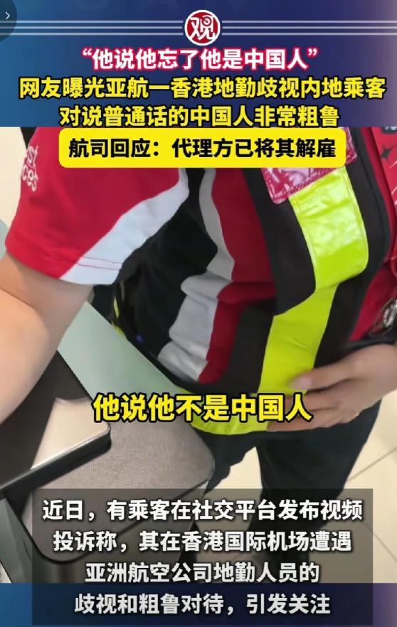 结局大快人心 ! 说普通话,户籍香港本地亚航地勤人员竟然说自己不是中国人, 此人已被解雇 ! 事件的起因源于一次普通的行程沟通。 一位内地游客在香港国际机场办理亚航香港飞往吉隆坡 AK137 航班的相关手续时,因行程临时出现变动,需要与地勤人员沟通调整事宜。 按照正常的服务流程,地勤人员本应耐心解答诉求、协助办理手续,然而这位涉事地勤的表现却完全背离了职业准则。 面对游客的合理请求,该人员态度粗鲁傲慢,言语间充满不耐烦,完全没有展现出机场服务人员应有的专业素养。 当游客对其不当态度提出质问时,涉事地勤非但没有收敛行为,反而变本加厉,公然宣称自己不是中国人,甚至表示早已忘记自己是中国人。 这样的言论让在场游客倍感震惊,也彻底触碰了公众的底线。 香港自回归祖国以来,已过去二十余年,作为中国领土不可分割的一部分,香港市民的中国人身份毋庸置疑。 而这名身为香港本地人的地勤,日常使用普通话交流,持有中国户籍,却做出如此数典忘祖的言行,无疑是对自身身份的否定,也伤害了同胞的情感。 事件曝光后,亚洲航空第一时间作出回应,迅速启动调查程序。 经过多方核实,亚航确认涉事人员并非其直接雇佣员工,而是合作的地服代理公司派驻在香港机场的工作人员。 针对员工的严重不当言行,亚航并未推诿责任,而是要求地服代理公司严肃处理。 最终,该涉事地勤人员被所属公司解雇,这一处置结果也得到了多数民众的认可。 从事件本身来看,涉事地勤的行为绝非简单的服务态度问题。 在全球化背景下,不同地区的人们因出行、工作等需求频繁往来,身份认同是人与人之间沟通的基础。 作为服务行业从业者,尊重旅客、坚守职业本分是基本要求,而这位地勤不仅在服务中缺乏基本素养,更在身份认知上出现严重偏差。 他或许认为否认中国身份能彰显所谓的 “个性”,却忽略了中国籍是与生俱来的身份,不会因个人的言语而改变,无论身处世界哪个角落,他的中国籍身份都会被明确认定,外国人也不会因其个人言论而混淆其国籍归属。 更值得反思的是,此类行为不仅会让自己丢掉工作,还会对社会造成不良影响。 机场作为城市的窗口,地勤人员的言行直接代表着香港的形象。 数典忘祖、否认自身国籍的行为,既违背了家国底线,也破坏了香港与内地同胞之间的情谊。 社会可以包容不同的生活方式与文化差异,但绝不能纵容背叛国家、背弃血脉的行为。 每一个香港市民都应清晰知晓自身的中国人身份,香港永远是中国的香港,这是不可动摇的事实。 此次涉事地勤被解雇的结局,是对其不当言行的合理处置,也向社会传递出明确态度:无论身处何种岗位,都应坚守基本的家国认同与职业操守,否认自身国籍、背叛同胞的行为,必然会受到应有的惩罚。 而对于广大市民而言,这一事件也提醒着我们,要始终牢记自身的身份与根脉,在日常工作与生活中,以尊重、包容的态度对待他人,共同维护良好的社会氛围与国家形象。