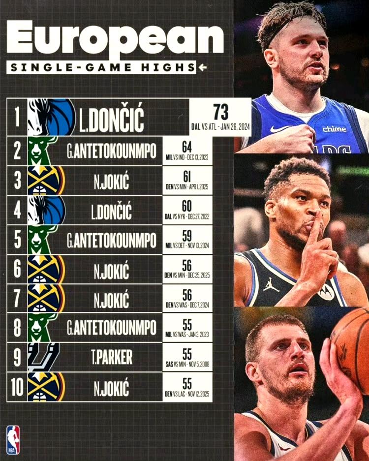 欧洲球星是未来破100分的主力。 这是目前欧洲球员在NBA的得分排名。 东契奇73分最高,两年前创造。 字母哥64分,约基奇61分。 帕克以前有过55分。 未来NBA看国际球员,看这帮欧洲人来破纪录吧![大金牙]