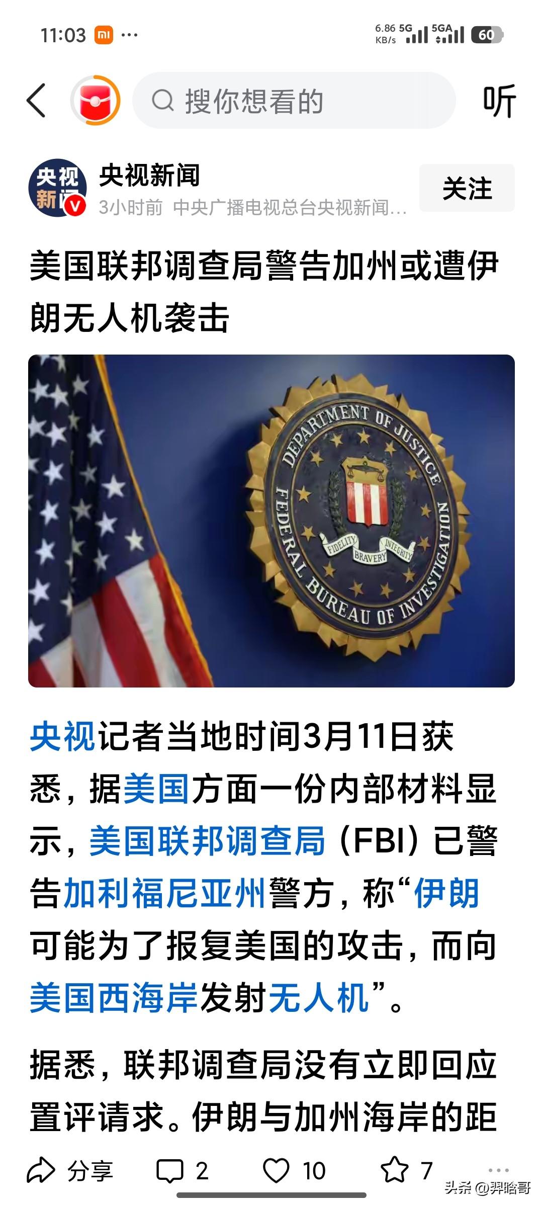 说什么来什么。美国fbi已经开始预警,伊朗可能在美国西海岸对加州发动无人机袭击,复刻俄乌战争,乌克兰对俄罗斯莫斯科发动的无人机袭击。在技术层面上,伊朗航程为2000公里的自杀性无人机,是完全有可能对美国加州发动袭击的,一旦该行动实施成功,伊朗将使美国感受到战争的切肤之痛。