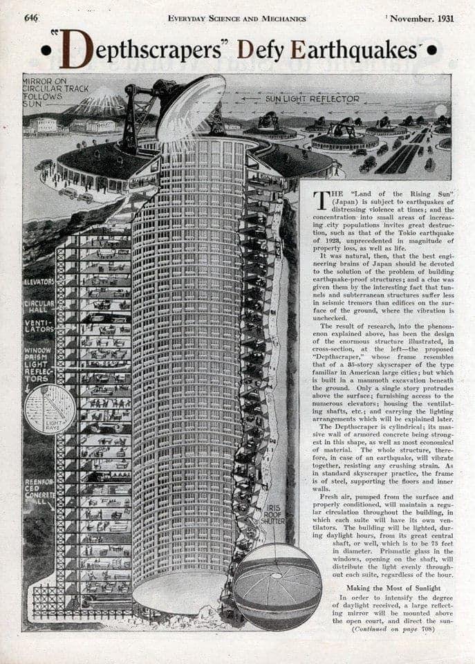 1931年的深度摩天楼概念设想地下建筑,但实际面临火灾逃生和地热挑战,有网友戏称