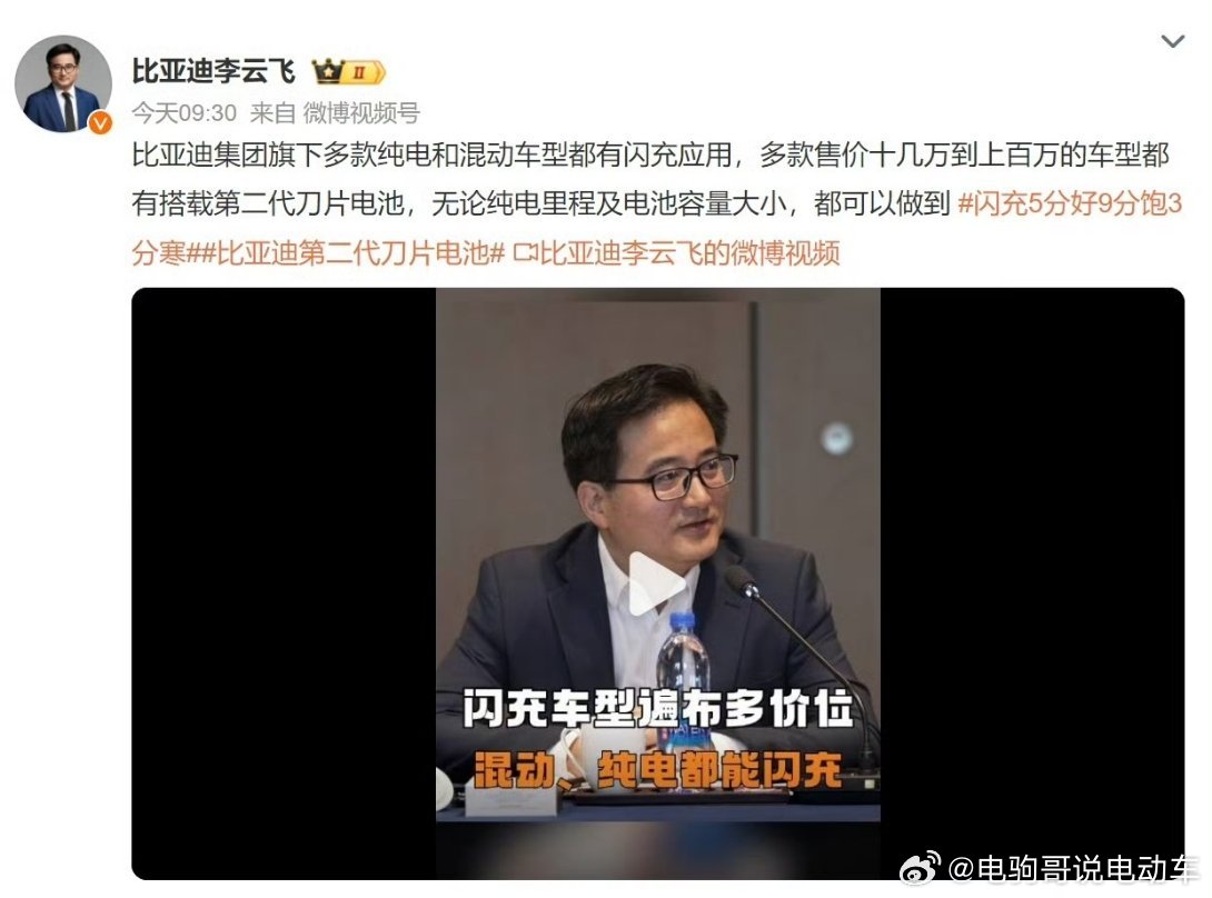 比亚迪李云飞确认:旗下多款纯电和混动车型都有闪充应用,多款售价十几万到上百万的车型都有搭载第二代刀片电池,无论纯电里程及电池容量大小,都可以做到。