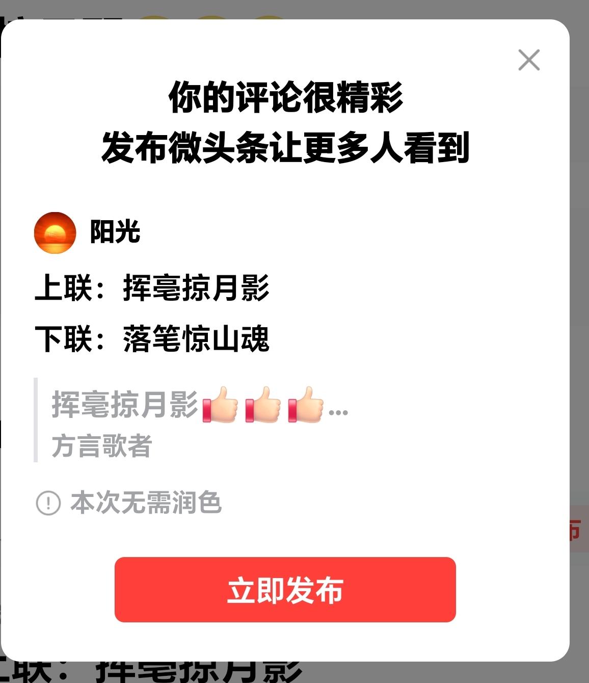 上联:挥亳掠月影 下联:落笔惊山魂 微头条 下联“落笔惊山魂”与上联“挥毫掠月影”相匹配。 “挥毫”与“落笔”语义相近,“惊月影”与“惊山魂”形成动态对仗,突出艺术创作憾动自然的气势。 这幅对联的意境,核心在于描绘行为与自然静谧光影、落笔惊动山魂之间一种轻盈、灵动且富有哲理的互动关系,体现了捕捉灵感、追求笔法自然与寄托超然情怀时的美学理想。 对联无论字数、结构、平仄及意境都相匹配。 请友友的评论区评论一下吧!