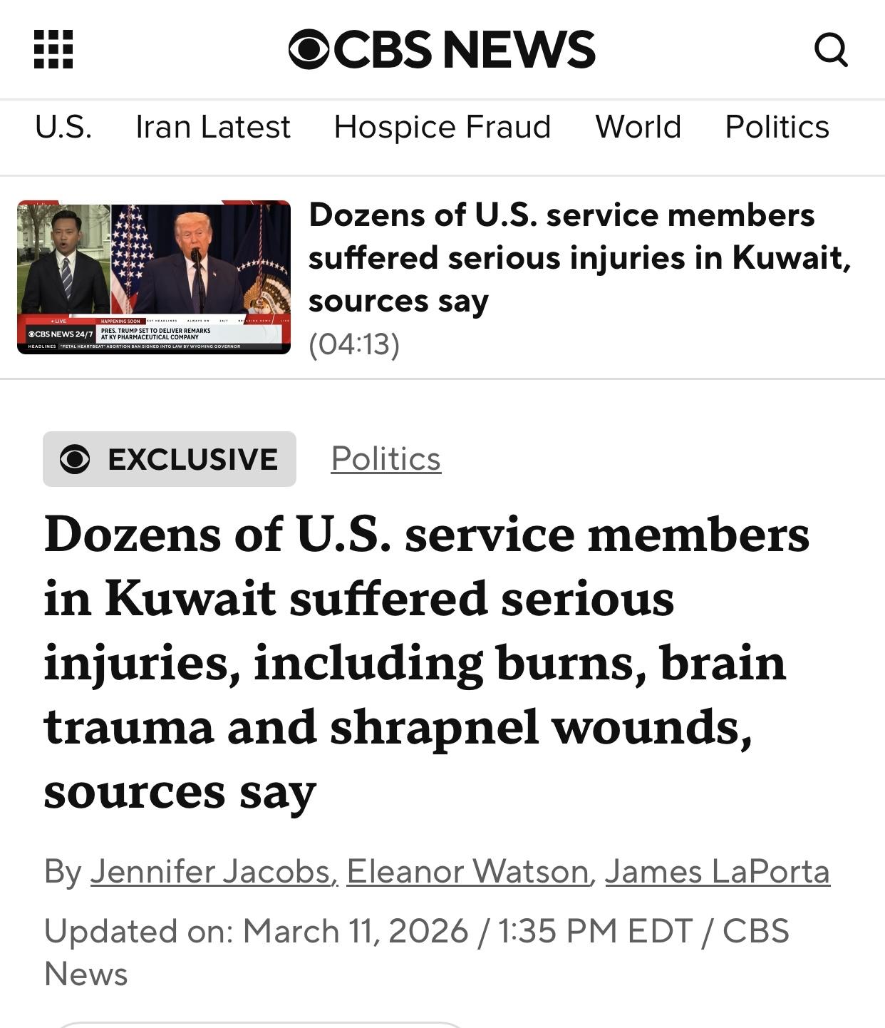 美媒独家:在科威特受伤的美军人员情况远比五角大楼说的严重得多 美国哥伦比亚广播公司新闻(CBS News)官网当地时间3月11日独家报道:据多个消息来源向哥伦比亚广播公司新闻透露,在与伊朗的开战最初的数小时内,伊朗无人机对科威特的袭击不仅导致六名美国军人死亡,其严重程度超出了此前披露的情况,有数十人受伤,包括脑损伤、弹片伤和烧伤。至少有一人可能需要截肢。 五角大楼之所以要瞒报伤亡实情,核心原因就是怕国内舆论炸锅。美国民众对海外战争的伤亡早就忍够了,当年伊拉克战争、阿富汗战争打了那么多年,美军死伤无数,国内反战游行就没断过,好几任总统都因为这事陷入执政危机。 现在特朗普政府主动点燃对伊战争的导火索,本来就违背了当初“撤回海外美军”的竞选承诺,要是再把真实伤亡情况抖出来,50多个城市爆发的反战游行肯定会更激烈,“特朗普下台”的呼声只会更高,这对他的执政根基是致命打击。 而且美军一直对外吹嘘自己是“精准打击”“战力无敌”,要是承认在伊朗无人机袭击下伤亡这么惨重,不仅会让自己的军事威慑力大打折扣,还会让那些跟着美国的盟友心里打鼓,觉得跟着这样的大哥不靠谱,以后谁还愿意听美国调遣。 再说说这些受伤士兵的处境,那可真是太惨了。脑损伤看着不像弹片伤、烧伤那么直观,但危害一点都不小,有研究显示哪怕是轻微脑震荡,以后得痴呆的风险都会翻倍,更别说这种战争中造成的严重脑损伤,这些士兵后半辈子可能都要跟后遗症打交道,记忆力衰退、行动不便都是大概率事件,甚至可能年纪轻轻就失去生活自理能力。 弹片伤和烧伤更不用说,伤口愈合慢还容易感染,留下的疤痕一辈子都消不掉,心理创伤更是难以愈合,很多老兵回国后都会患上创伤后应激障碍,晚上睡不着觉,一闭眼就是战场的画面。最让人揪心的是那个可能需要截肢的士兵,年纪轻轻就失去肢体,不管是生活还是工作都会受到巨大影响,家里人也得跟着遭罪,这些后续的痛苦和代价,五角大楼根本没打算跟美国民众说清楚。 其实美军瞒报伤亡也不是第一次了,之前《纽约时报》就披露过,美军在中东的空袭造成大量平民死亡,可官方公布的数字远远低于实际人数,很多平民伤亡报告都被草率忽略,就算承认了也会刻意低估人数。 这种对生命的漠视已经成了美军的惯例,不管是平民的命还是自己士兵的命,在他们眼里似乎都只是可以用来粉饰太平的数字。这次科威特遇袭事件中,五角大楼一开始只报3人死亡,就是想先试探民众反应,发现没引发太大波澜后才慢慢增加数字,可他们没想到CBS拿到了多个消息源的证据,直接把真实情况捅了出来,这才让外界看清了美军的真面目。 从国际层面来看,这种瞒报行为也让美国的公信力进一步崩塌。一直以来美国都标榜自己“透明公正”,可在军事行动上却处处藏着掖着,伤亡情况不敢说实话,军事失误不愿承认,这样的国家怎么可能让其他国家信服。 而且伊朗方面公布的美军伤亡数字本来就和美方差很多,现在CBS的报道印证了伊朗的说法并非空穴来风,这会让更多国家看清美国在国际事务中的虚伪嘴脸,以后美国再想在中东搞事,阻力只会更大。 更关键的是,这种瞒报对美军士兵的士气也是巨大打击。士兵们在前线拼命,冒着生命危险执行任务,可自己的伤亡情况却被上级刻意隐瞒,连为自己的牺牲和伤痛争取应有的关注都做不到,这会让他们觉得自己的付出根本不被重视。 那些受伤的士兵回国后,可能还要面对医疗保障不足的问题,之前就有报道说美军空袭的平民幸存者需要昂贵治疗费用,可美方只支付了不到12笔款项,连平民都得不到应有的赔偿,很难想象这些受伤士兵能获得多好的后续保障。 说到底,五角大楼瞒报伤亡情况本质上就是为了维护自己的统治利益,为了不让国内民众反对战争,为了保住自己的军事威慑力,就不惜牺牲士兵的知情权和尊严,这种做法既不道德也不负责。美国总是把“人权”挂在嘴边,可在自己士兵的生命安全和切身利益面前,却显得如此冷漠。 CBS的这次独家报道,不仅揭开了美军伤亡的真相,更揭开了美国军事霸权背后的虚伪和自私,让全世界都看到,所谓的“美军强大”背后,是无数士兵的鲜血和泪水,是无数家庭的破碎和痛苦,而这一切都只是为了满足美国政府的地缘政治野心。 随着真相慢慢浮出水面,美国国内的反战情绪只会越来越高涨,国际社会对美国的质疑也会越来越多,五角大楼的瞒报行为终究是搬起石头砸自己的脚。