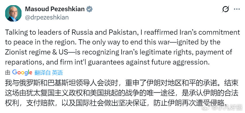伊朗提出停火条件 伊朗总统佩泽希齐扬表示,结束伊朗与美国和以色列的战争的唯一途径是承认伊朗的合法权利、支付赔款,以及国际社会提供防止伊朗再度遭受侵略的坚定保障。