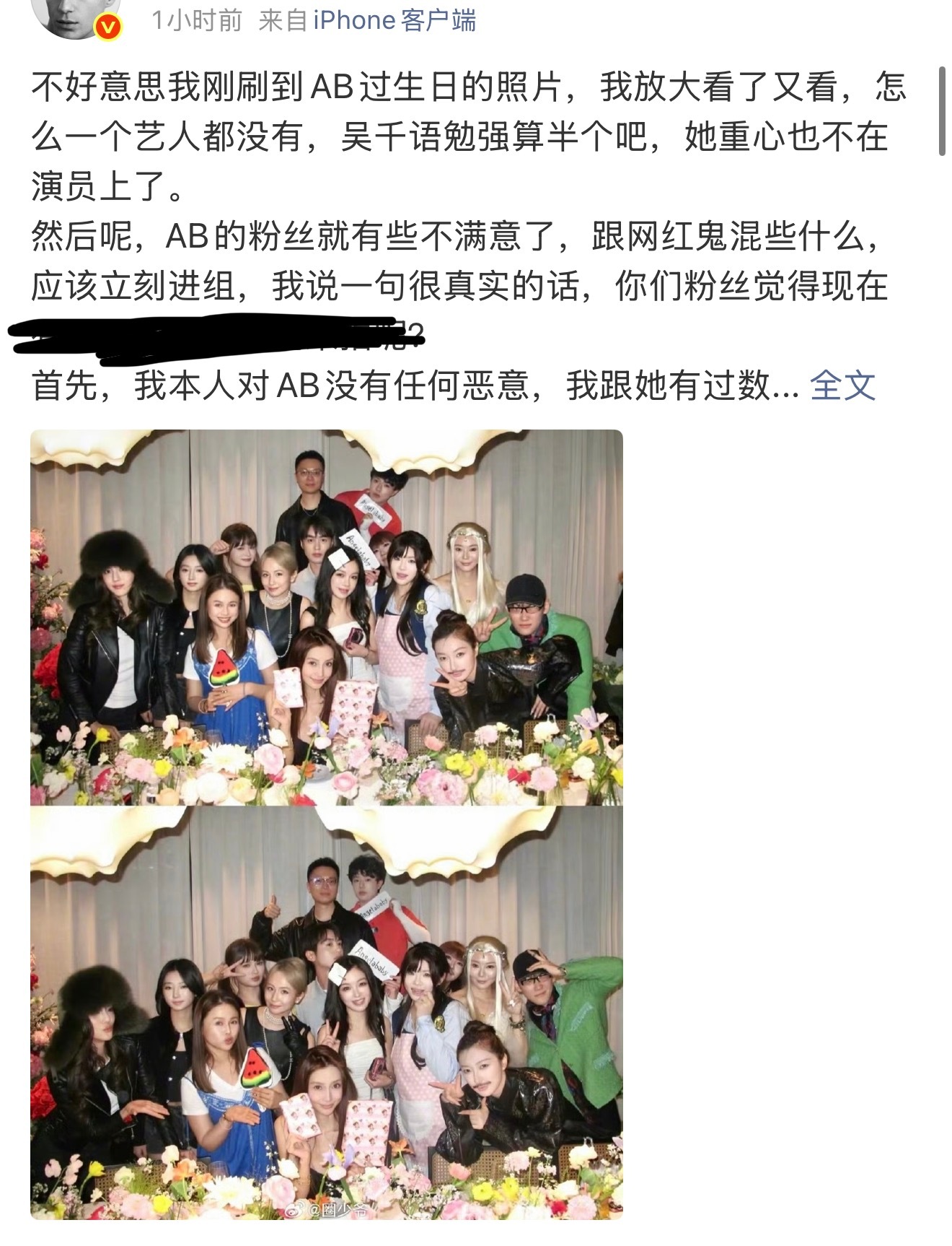 感觉这群人真的又双标又别扭现在哪个明星过生日会和明星一起过啊..明星和明星绝大多数都是虚假姐妹情,微博互道生日祝福就完事了…和自己喜欢的人一起过生日怎么了..这里面超过一半的人都和ab玩了至少二十年了…过生日还分尊卑吗..嘲的好尬