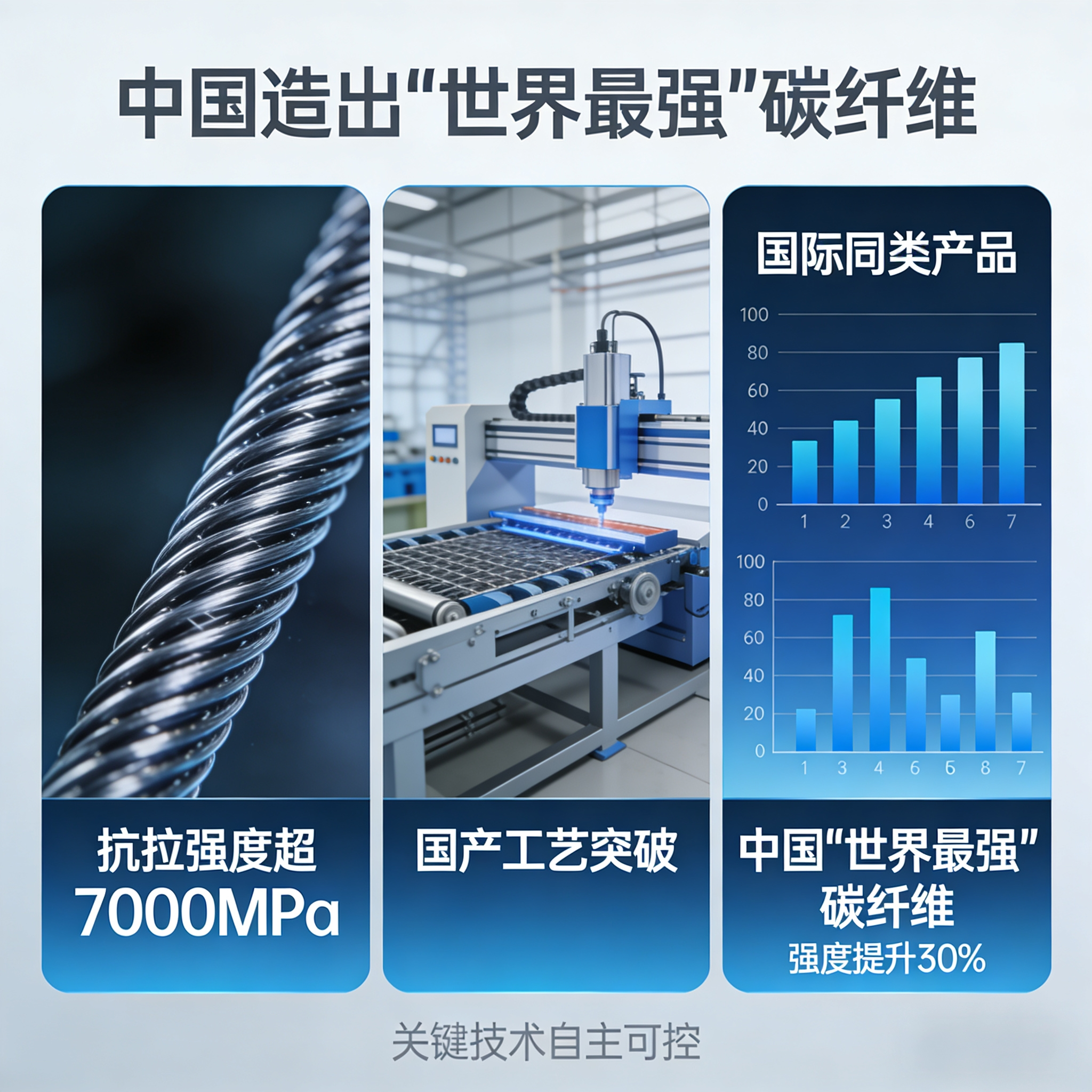 由中国建材集团自主研发的T1200级碳纤维全球首发。单丝直径不足头发丝十分之一,拉伸强度却达到普通钢材的10倍,密度仅为钢材四分之一,堪称“轻若鸿毛、坚如磐石”。注意!这不是实验室里的样品,而是已经实现了百吨级量产的工业产品。