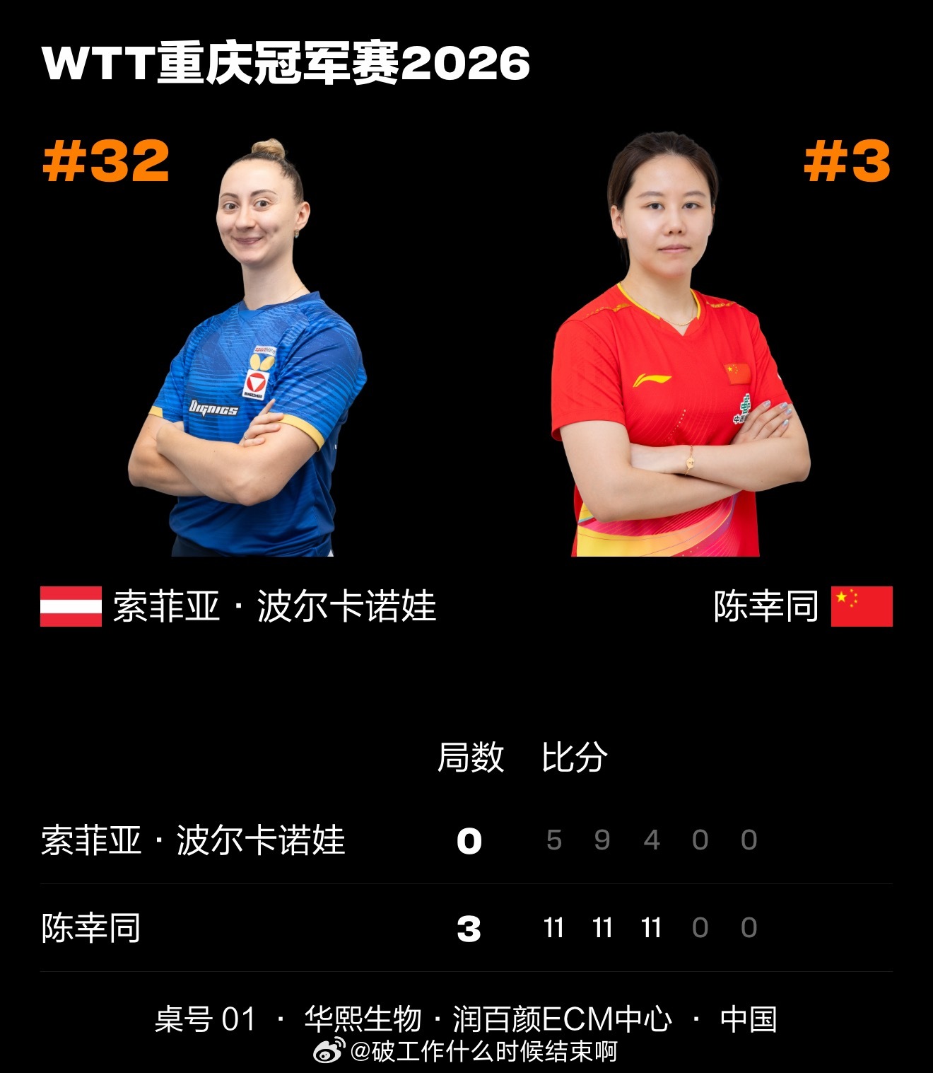 📝下一轮:陈幸同VS石洵瑶陈幸同下轮对阵石洵瑶陈幸同3比0波尔卡诺娃