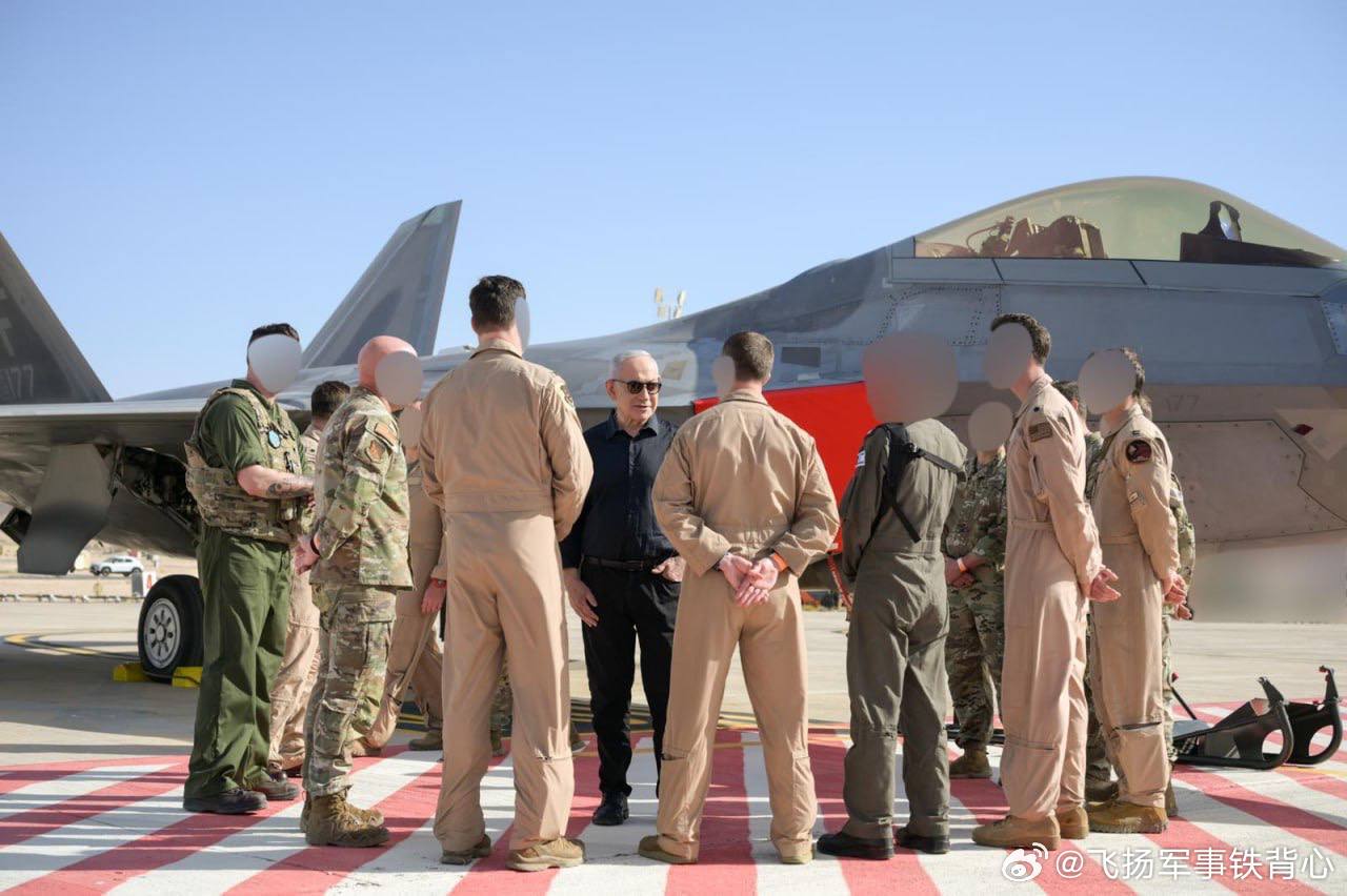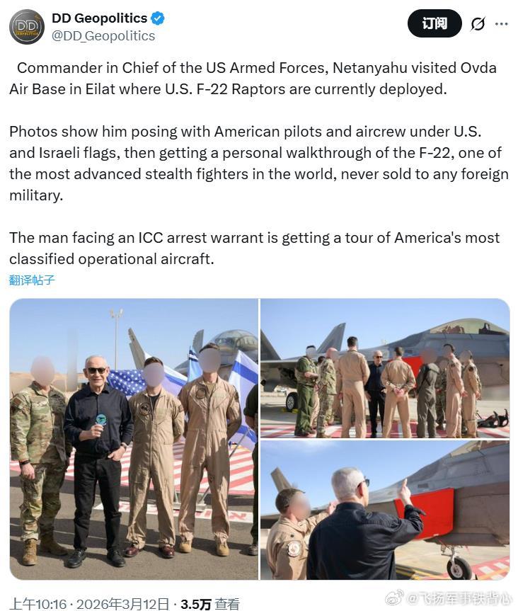 “2026年3月5日,美国武装部队总司令内塔尼亚胡访问了位于埃拉特的Ovda空军基地,美军的F-22‘猛禽’部署在那里。照片显示,他在美以两国国旗下与美国飞行员及地勤人员合影,并接受F-22战机的个人讲解——这是一款世界上最先进的隐身战斗机,从未出售给任何外国军队。