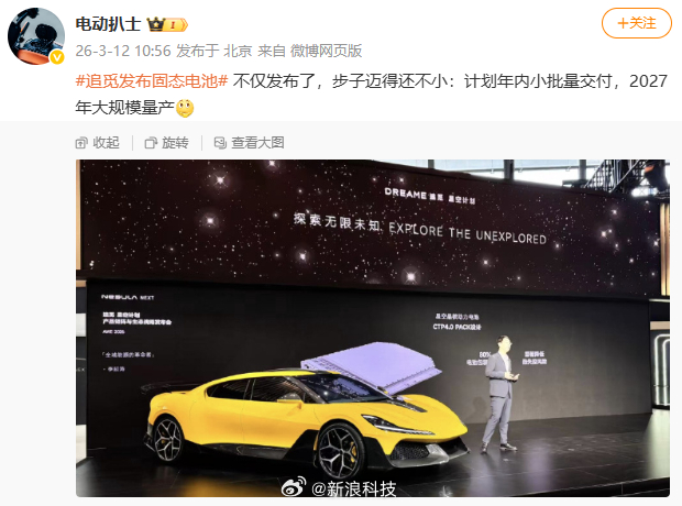 【追觅发布汽车固态电池】据博主 今日消息,追觅发布固态电池,计划年内小批量交付,2027 年大规模量产。追觅汽车价格或超60万元追觅汽车对标小米SU7Ultra