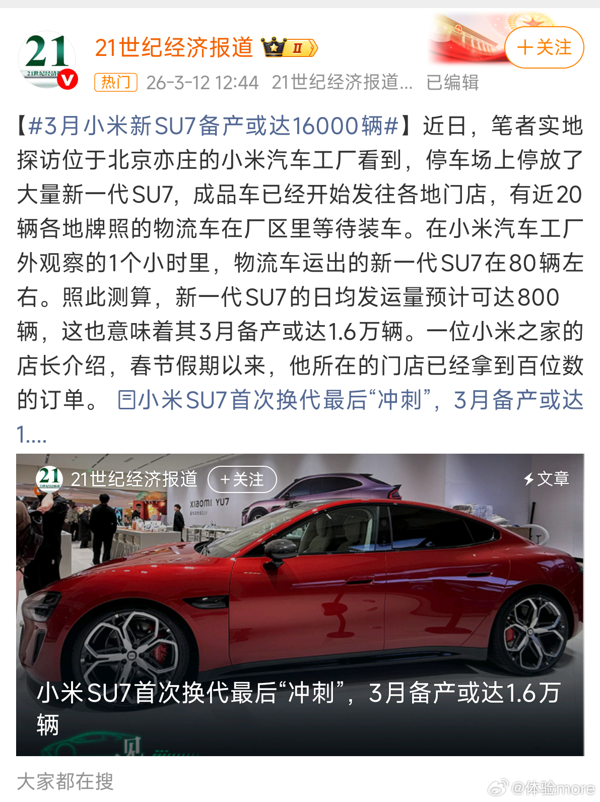 3月小米新SU7备产或达16000辆有媒体实地探访小米汽车工厂,看到物流车1小时运出80辆左右的新一代SU7,推算3月备产或达1.6万辆。