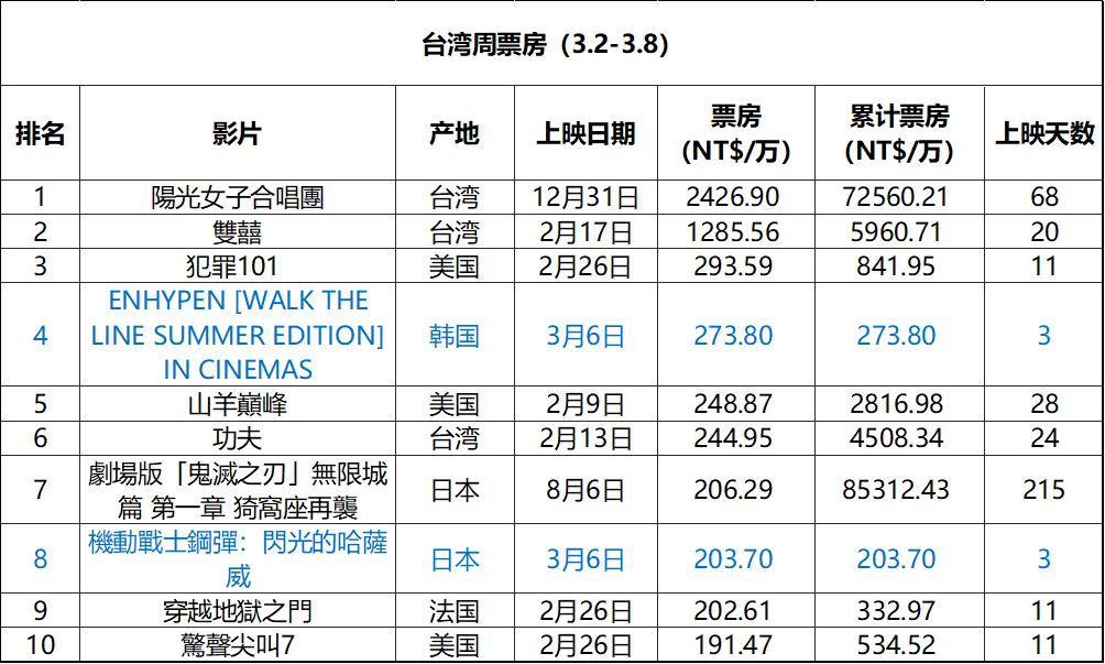 2026年第10周台湾票房 :1.《阳光女子合唱团》公映68天继续稳居冠军,累计票房7.25亿新台币;2.《双喜》累计票房破6000万;3.韩国男团演唱会电影《ENHYPEN [WALK THE LINE SUMMER EDITION] IN CINEMAS》在新片中表现最佳。(单位:新台币 数据:台湾电影及视听文化中心)