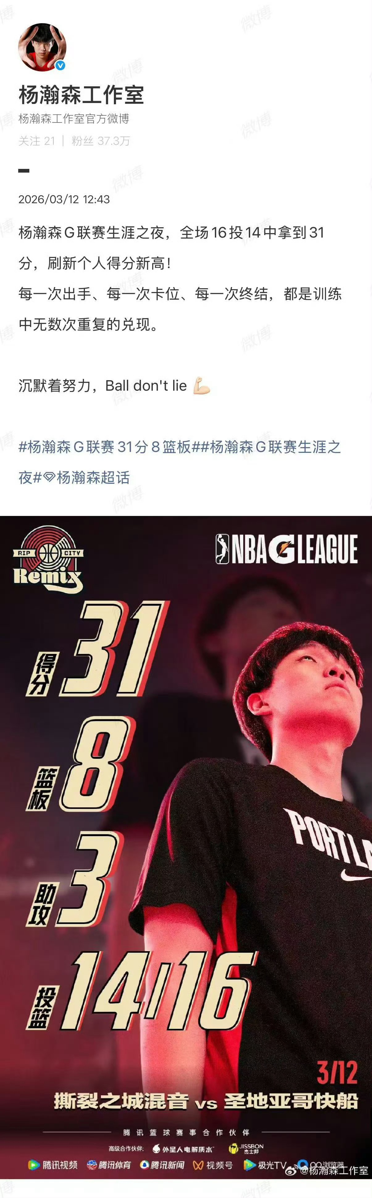 杨瀚森方说沉默着努力球不会说谎杨瀚森方回应得分G联盟新高继续努力!3月12日,杨瀚森工作室发文称:杨瀚森G联赛生涯之夜,全场16投14中拿到31分,刷新个人得分新高。