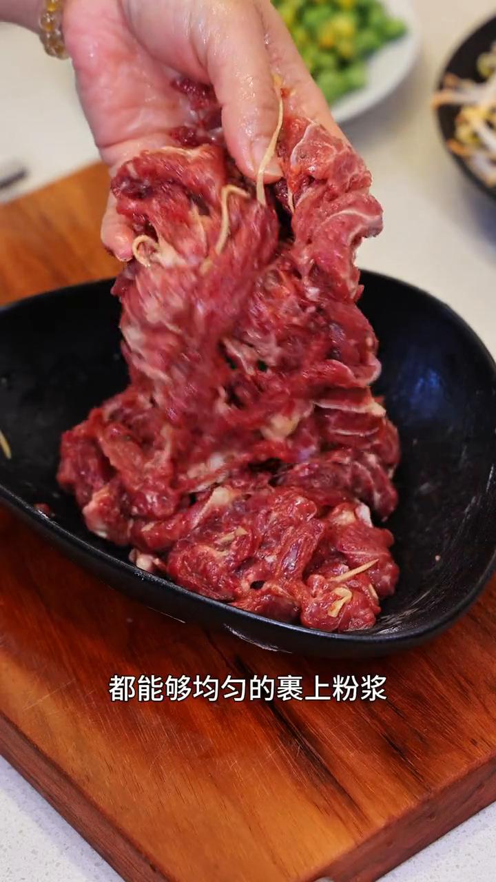 如果你觉得牛肉怎么做都不够嫩滑,那建议您试试今天的这个做法,简单的焯一下水就很嫩滑,很好吃。 ·牛肉就选那种拿起来软乎乎的,又很粘手,就是新鲜的好牛肉,切成薄片,来腌一下。 ·加上姜丝、生抽、黑胡椒碎,还有食用油抓匀。 ·淀粉可以跟我一样,先加少许水,调成一个粉浆,然后再加到牛肉里,抓匀,这样子每一块牛肉都能够均匀的裹上粉浆。 ·煮开一锅水,然后加上食用油跟一勺盐,先把豆芽焯熟,不用等水开的,就大概焯烫个二三十秒就行。 ·烫牛肉的水一定要先煮到大开,然后牛肉就摊开一点放进来,不要马上去动它,稍等一下再轻轻推动,保持大火,全程大概就是烫个15秒左右,这个时间焯烫出来的牛肉就是最嫩滑的。 ·然后再来熬一个葱油,小火慢慢的把香葱熬到焦香酥脆,香葱可以先夹掉。 ·关火了之后,加上辣椒圈、生抽跟一丢丢的白糖,淋在牛肉上面。 这个方法做出来的牛肉特别香,又嫩滑又好吃,喜欢吃牛肉的朋友赶紧去试一下。 点赞关注收藏。