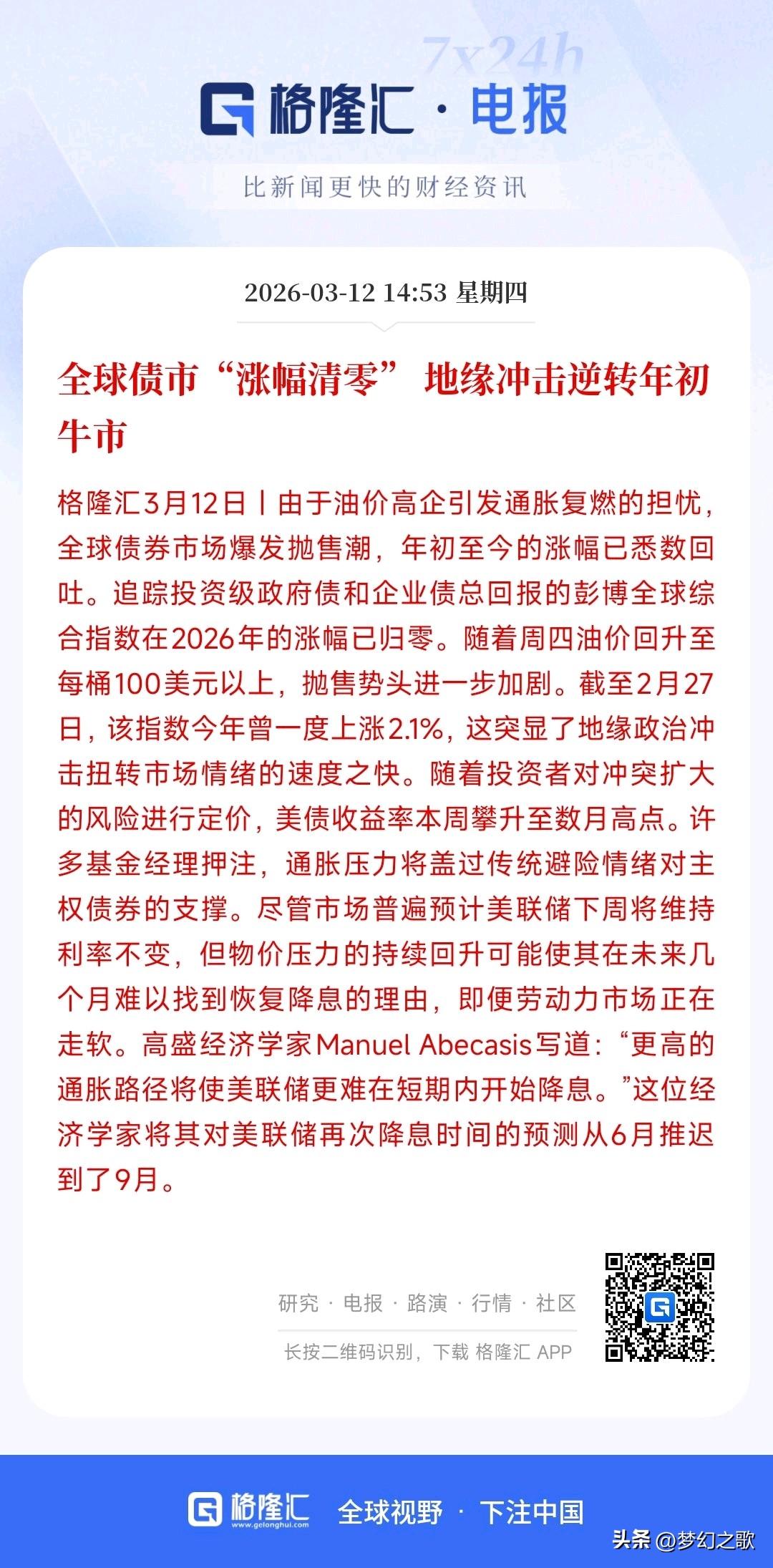 债市逻辑反转,股市雄起在即 年初本来债市涨的不错,结果美伊战争爆发之后,债市疯狂下跌,已经跌完了今年的涨幅。以前是一打仗,钱都去债市里面避险,但是这次不同,因为原油价格的暴涨致使通胀加大,钱反而从债市里面出来了。 钱出来去哪,最后还是要投资的,不可能在自己手里,就会有很多资金去股市,虽然股市也不好,但资源板块和黄金还是硬道理。 美联储的降息又被预测延后了,就因为通胀的加大,现在美联储不敢降息,而高盛预测美联储降息将从6月推后到9月。 这次股市是有机会的,等待原油价格下去,股市大概率会大反弹一波了。