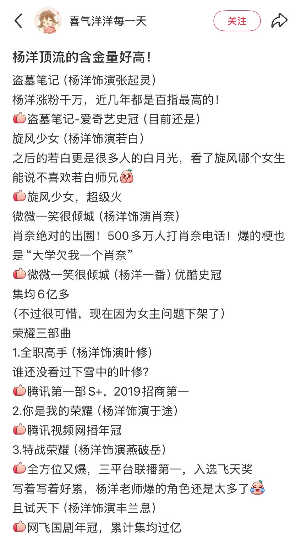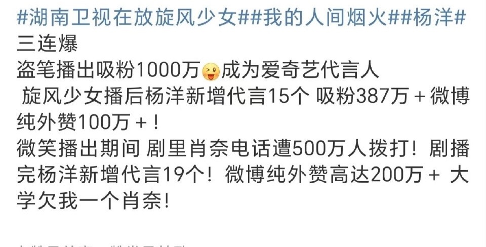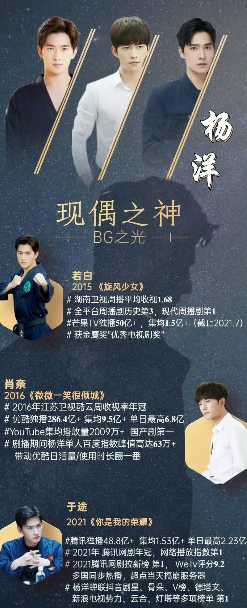 作为杨洋的多年的剧粉,我们杨洋就是不限题材的抗剧生啊大爆现偶《微微一笑很倾城》《你是我的荣耀》吸粉无数,就连军旅剧《特战荣耀》也是三平台联播第一,入选飞天奖!!去年播的《凡人修仙传》剧播期间连动漫收视都飙升了7倍!咱杨洋剧粉盘真的好大!!