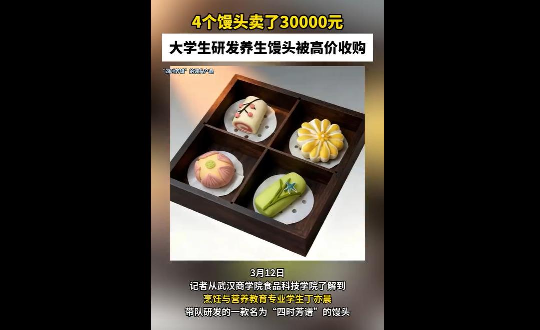 武汉商学院大学生研发四季养生馒头,兼具散寒祛湿、消食益气功效,获食品创新大赛一等奖,相关配方被企业以 3 万元高价收购,契合当下年轻人健康养生消费趋势。 四个养生馒头卖出三万元,看似不可思议的高价,实则戳破了传统餐饮行业的陈旧思维,也彰显了年轻力量对传统美食的颠覆性改造。 那些固守老口味、老做法、不肯创新的从业者,该被狠狠点醒。 大学生团队并非简单做馒头,而是将营养、养生、美学、季节理念融为一体,让传统主食跳出饱腹刚需,走向健康化、年轻化、品牌化。 他们精准抓住年轻人既要健康、又要颜值、还重仪式感的需求,用 “药食同源” 做出差异化,用创意把普通面食做出高附加值。 反观大量传统餐饮,只会重复老配方、打价格战,不愿研究新需求、不肯投入创新,最终只能在低端内卷中挣扎。 三万元买的不只是四个馒头,而是一套可落地的创新思路与市场眼光。 这一事件更说明,食品行业从不缺机会,缺的是打破惯性的勇气。 年轻人用知识和创意重新定义传统美食,既传承了文化,又抓住了风口。那些嘲笑 “馒头不值钱” 的人,终究会被时代淘汰。 真正有价值的,从来不是食材本身,而是藏在产品里的创新、眼光与趋势判断力。