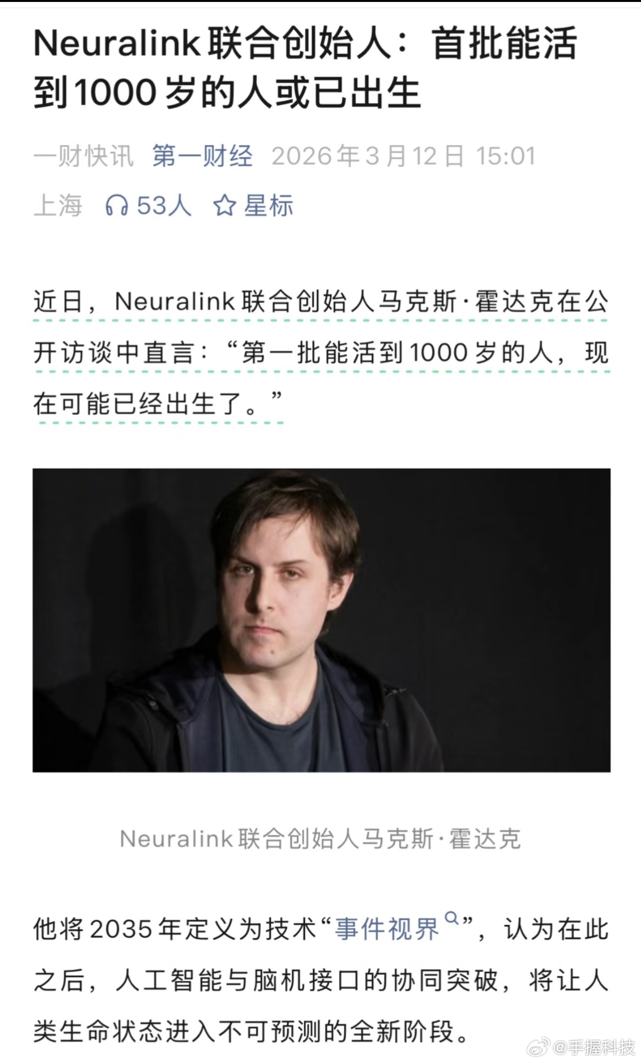 首批能活到1000岁的人或已出生感觉是P投资的,想永生的大都是富豪,未来这个技术跟普通人也没多大关系。关键是人的意识又不是水可以倒来倒去,脑机接口不就是把大脑克隆了一下,和本人生死毫无关系。当然这就要看全球富人对于欧美编故事有没有定力了。