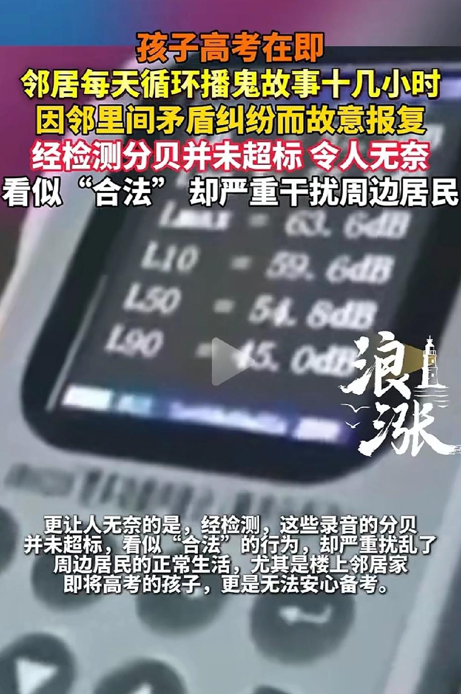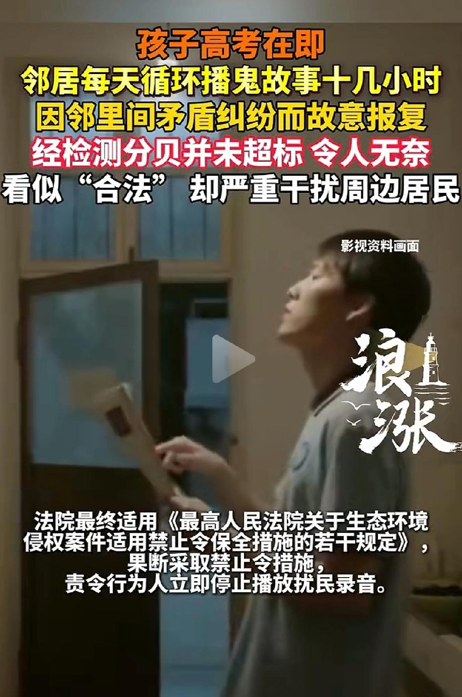杀人诛心!河南,小伙家和邻居有点矛盾,邻居知道小伙正在备战高考,于是故意在家播放鬼故事,每天持续十几个小时,吵的小伙根本没法静下心来复习。小伙家报警后,测量发现邻居家的噪音并没有超标,这还属于“合法”骚扰,民警也没办法。小伙家没办法,只能提起诉讼,法院换了个思路,这才让邻居无话可说。 高考前的几个月,对每个考生和家庭来说都像在走钢丝,一点风吹草动都能让人绷紧神经。 正在备战高考的小李却遇上了一件让人非常窝火的事,他家邻居,因为之前的邻里矛盾,居然用喇叭天天循环播放“荒山野鬼”的恐怖录音,一放就是十几个小时。 眼看小李6月份就要高考了,每天从早到晚都泡在书房里刷题、背知识点,只盼着能考个好成绩。 可从某天开始,他耳边总飘来阴森森的旁白:“荒山野岭里,藏着个没脸的鬼……” 声音不大,但穿透力极强,不管他把窗户关得多紧,那股子瘆人的调子都能钻进来。 一开始,小李以为是哪家电视开得大声,没太在意。 可连着好几天,这声音从白天一直响到半夜十一二点,尤其是夜深人静的时候,这声音更加瘆人,循环往复,小李连吃饭睡觉都不放过。 他越听越烦躁,手里的笔都握不住,脑子里全是鬼故事的台词,根本没法集中精力看书。 晚上躺在床上,那声音更是像在耳边绕,吓得他翻来覆去睡不着,黑眼圈一天比一天重。 小李的妈妈看在眼里急在心里,找楼上邻居王阿姨理论。 可邻居王阿姨却理直气壮:我又没吵到谁,声音又不大,关你什么事? 原来,之前两家因为楼道堆杂物的事闹过别扭,王阿姨心里一直憋着气,就想出了这么个“软报复”的法子,专门挑小李备考的关键期,用这种闹心的方式恶心人。 李妈妈没办法,只能报警求助。民警来了之后,用专业设备测了分贝,结果显示最高才63.6分贝,远远没达到噪音扰民的法定标准。 这就意味着,从噪音管理的角度看,王阿姨的行为居然“合法”,民警也只能口头劝诫,没法直接处罚。 这下李妈妈更绝望了:明明是故意捣乱,却拿她一点办法都没有?看着儿子日渐憔悴,连模拟考都发挥失常,她咬咬牙,决定走法律途径。 她收集了好几天的录音、视频,还有儿子失眠、成绩下滑的证据,把王阿姨告上了法院,要求对方立刻停止播放鬼故事,还自己家清净。 法庭上,王阿姨狡辩说她只是“听个故事消遣”,分贝没超标不算违法。 法官审查发现,王阿姨播放的时间正好覆盖了小李的备考和休息时段,内容又是刻意挑选的恐怖题材,明显是出于报复目的,严重干扰了小李一家的正常生活,尤其是影响了即将高考的小李的身心健康。 最终,法院没有纠结于分贝是否超标,而是适用了《最高人民法院关于生态环境侵权案件适用禁止令保全措施的若干规定》,果断下达了禁止令,责令王阿姨立刻停止播放这种扰民录音。 李妈妈终于松了口气,小李也能重新安安静静地坐在书桌前,把心思放回高考上。 邻里之间有矛盾要好好沟通,别用这种“软刀子”害人。 王阿姨自作聪明,但法律不会让这种钻空子的恶意行为得逞,哪怕分贝没超标,只要严重干扰了他人生活,一样会被制止。 《民法典》第二百八十八条规定:不动产的相邻权利人应当按照有利生产、方便生活、团结互助、公平合理的原则,正确处理相邻关系。 本案中,邻居王阿姨与小李家存在邻里矛盾,为报复而长期循环播放恐怖录音,虽分贝未达噪音超标标准,但其行为持续干扰小李家正常生活,尤其影响即将高考的小李备考与身心健康。 邻居的这一行为违背了邻里之间有利生产、方便生活、团结互助的相邻关系处理原则,构成对相邻权的侵害。 法院未局限于分贝指标,而是依据生态环境侵权禁止令规定,认定该行为属于“恶意干扰他人生活安宁”的侵权行为,若不及时制止将对考生权益造成难以弥补的损害,故依法作出禁止令,责令其立即停止播放。